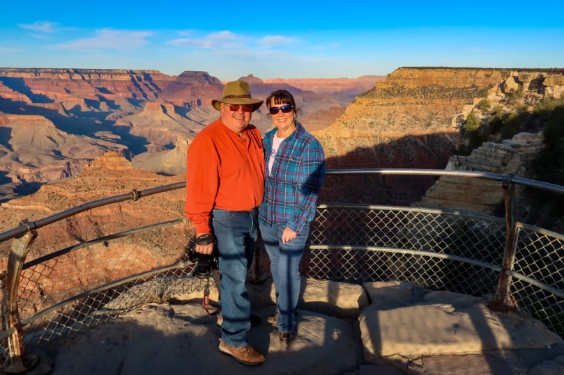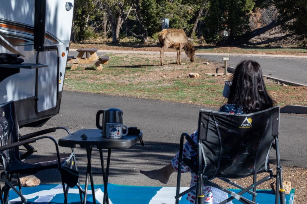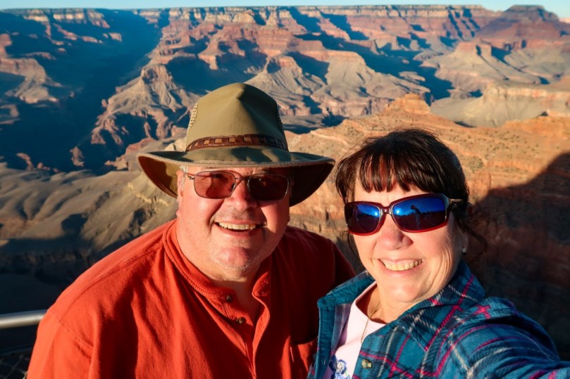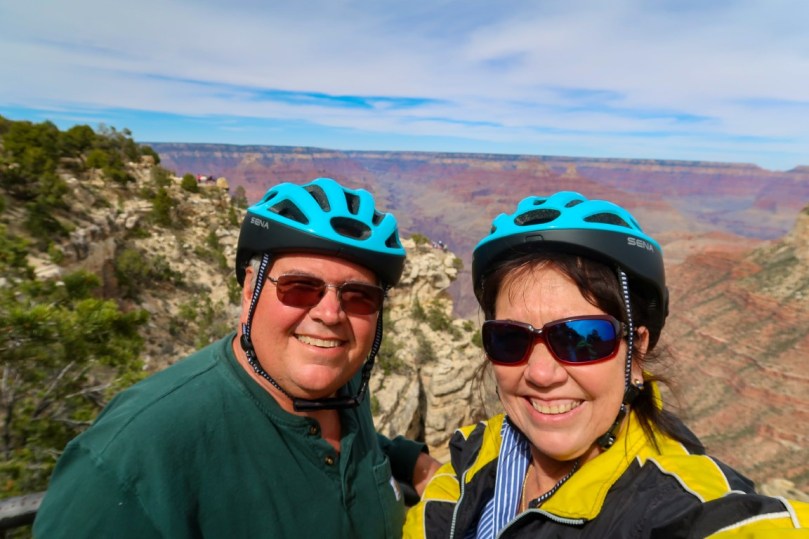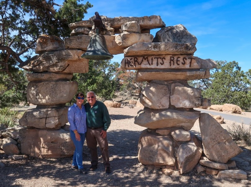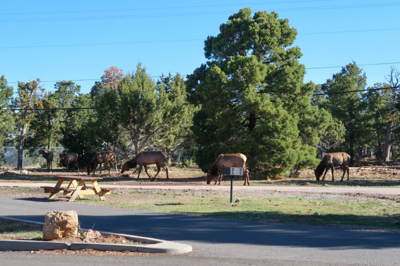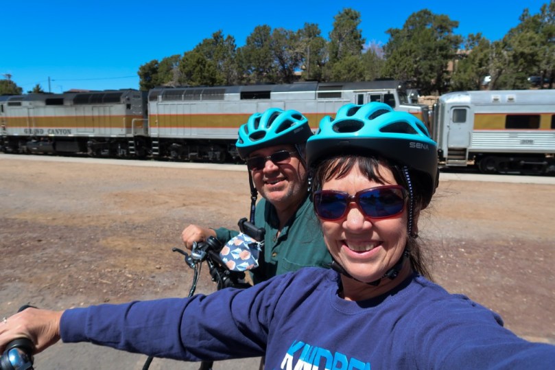 Grand Canyon was very cold place. 30* at night! 🥶❄️🥶 The park is 102 years old. The canyon width is 18 miles at its widest point and the floor is 4800 ft below the rim. 😱 The Colorado River flows 277 miles inside the park. Photographing this canyon is impossible! It’s one of those places you must see with your own eyes! Our campsite couldn’t be any better for right across from us is a grassy field and we are greeted with Elk morning, noon and night! 🦌 They are all over this park and have no fear of people. We put lots of miles on our bikes. A lot of hiking the rim and the beautiful trails this park offers. I even took a portion of the Bright Angel Trail! 🥾🚶🏻♀️This is the trail people can ride mules down to the bottom and spend the night before heading back up. Sunset pictures taken at Moran Point with a view of the river! Took a shuttle bus to Hermit’s Rest (which is at the end of the park) where we stood under the bell for good luck! Well I did it 4 times!!! 🤦🏻♀️ Sunday was an amazing day for we had booked months ago lunch reservations at El Tovar Lodge at the GC village! What a magnificent view, having lunch looking at the canyon. We are finally relaxing!!! Our last night we were exhausted from our day that dinner consisted of wine, pop tarts & pudding! 🤣😂😍