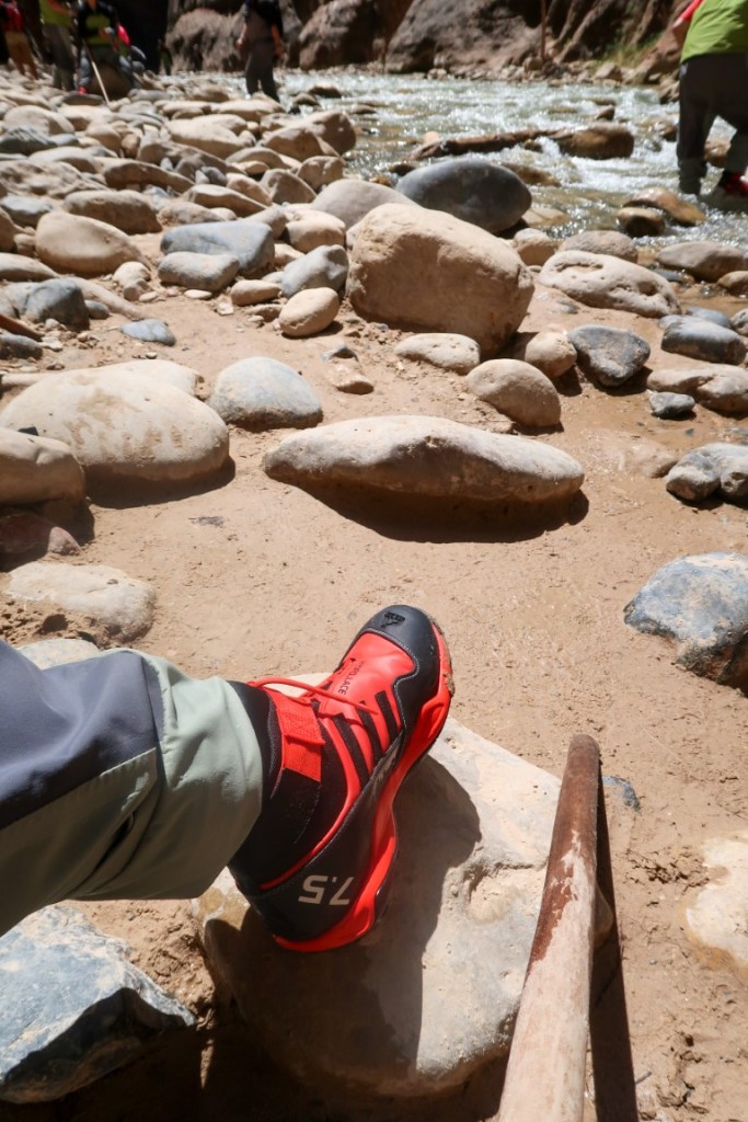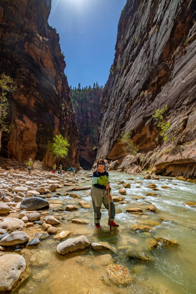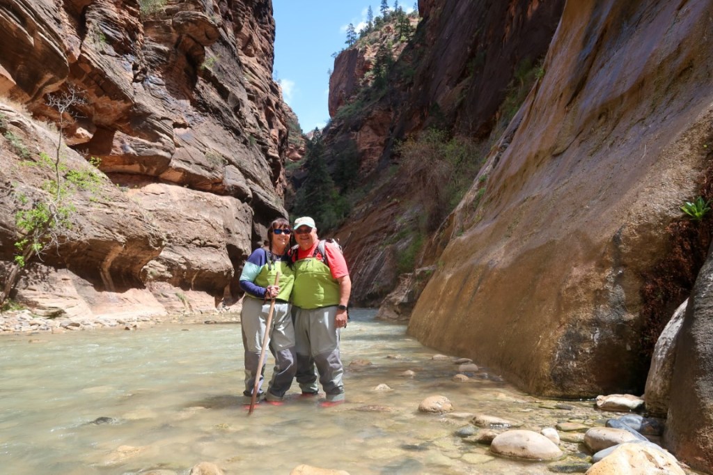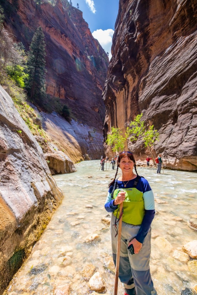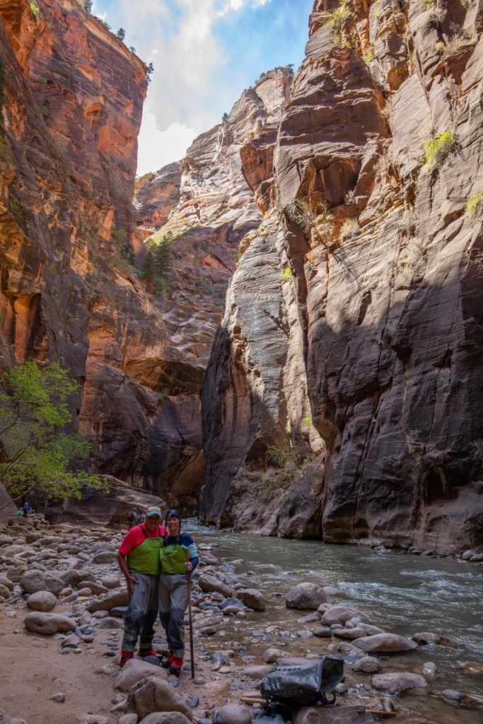 😍The most amazing adventure we have ever done! 👫🏻 The morning started with helping each other put on our rented waders, neoprene socks, then boots! This was hysterical. The water temperature is 36* so this was needed for us Florida folks. 🥶 Then packed our bikes up and rode all the way up to Temple of Sinawava to start our hike on the Riverside Walk for one mile to the beginning of the Narrows. The Narrows is the narrowest section of Zion Canyon. This gorge, with walls 2,000 feet tall and the river sometimes just twenty to thirty feet wide, is one of the most popular areas in Zion National Park. It’s an 8 hour hike, 9.4 mile, 334 ft elevation change, going up stream in a very rocky, slippery Virgin River. You are responsible for checking the weather, water levels, flash flood potential prior to attempting this hike. And sign a waiver! 🤦🏻♀️ The hike through The Narrows requires hiking in the Virgin River & a hiking stick is a must. You must get your feet wet since there is no trail, switching sides trying to stay in the shallowest part of the river. Most of the time the water was below our waist. What a beautiful but challenging adventure. Such beauty all around us. We then dragged our tired bodies up the path to our bikes where passer-bier’s got a laugh for we needed each other’s help to get these wet shoes and waders off and into dry clothes & sandals for our long ride back down the mountain. So after a 17 mile round trip bike ride 🚴, 2 miles walking on the trail & 2 1/2 miles walking on rocks in the river, we came back cold & exhausted! It was hot soup & called it a night. 💤