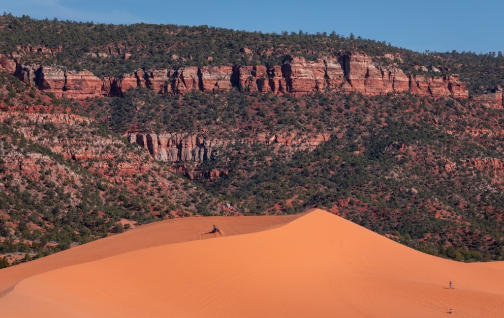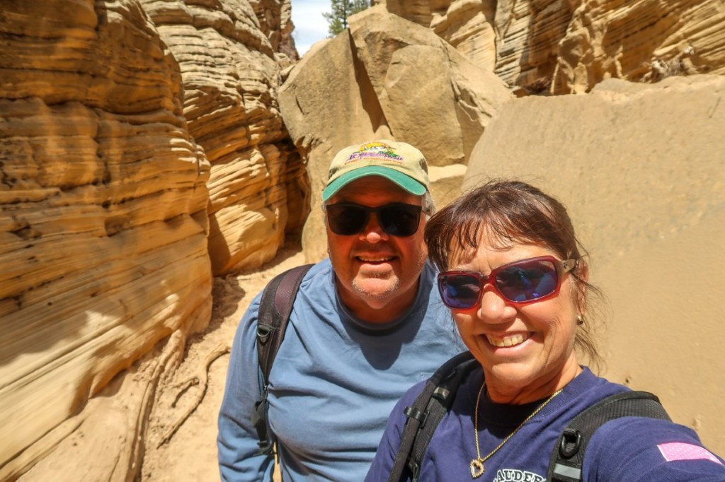 😱 I’m so confused today with what time it is because we left Utah, crossed into Arizona to then go back into Utah! ⏰ 😂 In Utah you can’t buy wine or alcohol in stores (only beer 3.2%) you have to go to a State Liquor store which are not easy to find so when we crossed into Arizona they had a “last chance liquor store” so we got some wine! Scenery was…..yup more rocks as far as you could see! We stopped at Pipe Springs National Monument which was an amazingly awesome surprise! We were able to catch the tour of the fort. What a great restoration of the fort and settlement for we felt like we were in a real western town! Pipe Springs lies in a vast desert between the Grand Canyon and the Vermillion Cliffs of northern Arizona. Ancestral Puebloan people arrived around 300 BCE, followed by related Southern Paiute tribes who still live here due to the water that slowly percolates down to impermeable layers. In 1700s, Spanish missionaries and explorers passed through. Members of the Church of Jesus Christ of Latter-day Saints(Mormons) came to area and settled in mid 1800s. Pipe Springs meant 3 things; water, shade and rest for hundreds of couples and cowboys! Couples would travel 4 days by foot or wagon to and from St. George Temple to get a marriage license and then 4 days back to get married giving the over 400 miles the name “Honeymoon Trail”! 💒 We then drove through Fredonia founded in 1885. So much history in this area. We got to Kanab to set up and go on yet another adventure for the day. Went to Coral Pink Sand Dunes State Park where YES we took out our red saucer sleds we bought in Ohio when we picked up Ruby and slid down the dunes. A lot of fun but the walk up was tiring. Sand dunes are created by 3 factors, sand, high winds and a unique influence upon those high winds. Known as the Venturi Effect..after the wind passes through the notch and into the open valley, wind velocity decreases, depositing the sand. The pink color of the sand comes from the eroding Navajo sandstone. We stopped off at the Bureau of Land Management visitor center to scope out trails etc! The next day was hike our ass off to see amazing back country trails in 4wd to see slot canyons. Lick Wash trail, Willis Creek trail then had to stop at Mossy Cave & waterfall in Bryce Canyon since it was on the way back! A great hike and saw ice in this grotto! Now on our last day here, it was laundry time before we pack up to our next adventure in Arizona again! 🧺