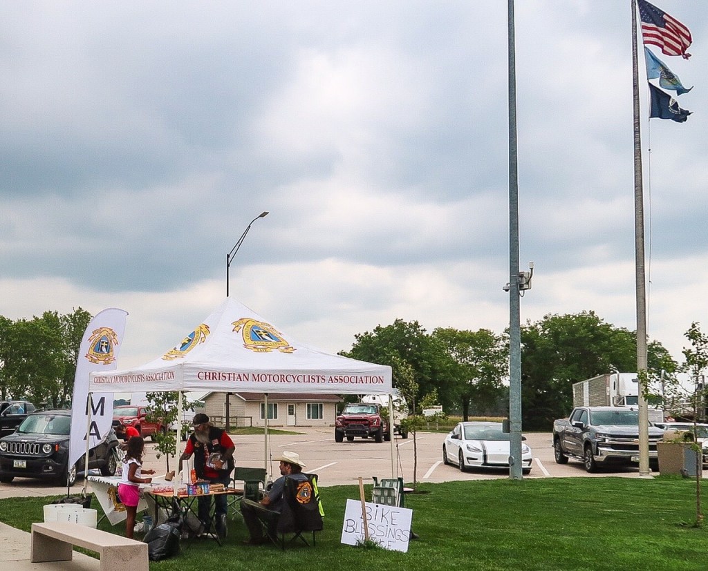 1:09pm Toured the South Dakota visitor center and got a lot of information & suggestions from gentlemen working there! He was genuinely excited for our adventures and kept suggesting other places to go! We walked out with a stack of brochures! 😳 Outside the visitor center a Motorcyclist Christian tent was there for bikers with informational giving them water & snacks!