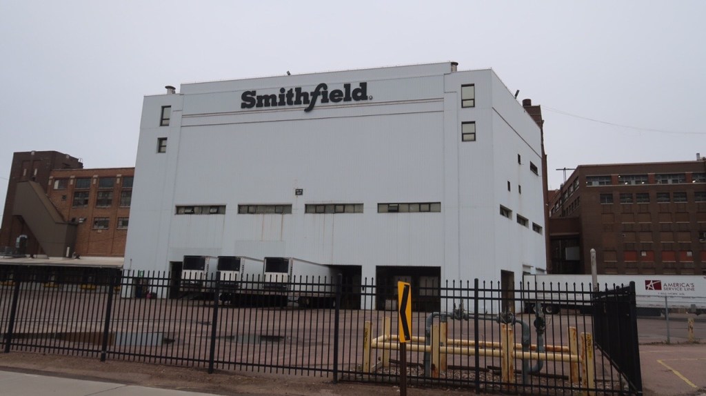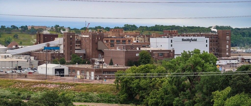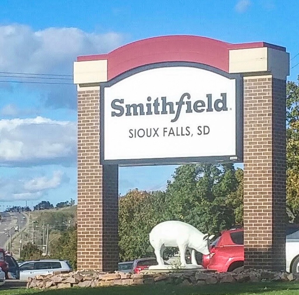 On our way to Sioux Falls we passed Smithfield plant….oh the aroma of bacon! Largest hog producer & pork processor in the world. The company traces its history back to 1936 in Smithfield, Virginia where the main headquarters are. Vertical integration allows Smithfield to control every stage of pig production, from conception and birth, to slaughter, processing and packing, a system known as “from squeal to meal” or “from birth to bacon”.