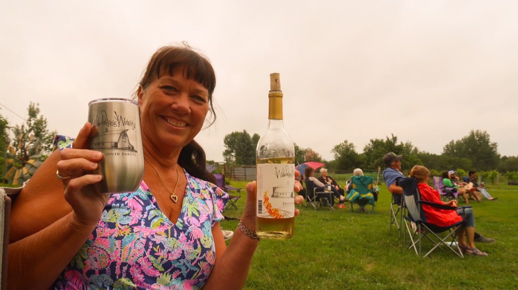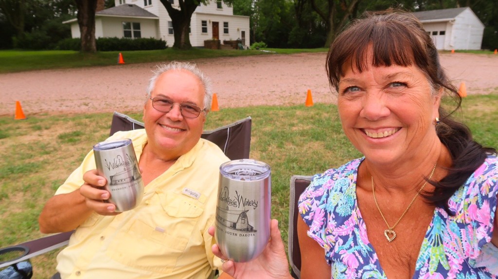🍷Wilde Prairie Winery…is a family farm located just west of beautiful Splitrock Creek on wonderful rolling hills perfect for growing grapes. They produce many fun wines all produced from South Dakota grown fruit and honey..The winery is run by Jeff & Victoria along with the help of their children and many friends. They have been making wine for more than 25 years and became South Dakota’s 9th farm winery in July 2004. The first vines were planted in 1997 and now have 2000+ vines. They have wine tasting, bottles of wine and snacks in an old barn. 🍷 Lots of country charm. ❤️🎼Music in the Vineyard 🍇 2 – 5 pm Live Music….. August 7th – Geoff Gunderson. So we enjoyed sipping our wine ( we bought a bottle of Brianna & a bottle of Frontenac, a charcuterie snack and 2 thermal cups), listening to great music on a rolling hill just relaxing and meeting the locals. On the way back we stopped at Sunshine Foods for a few items then went to campground and got things ready for tomorrow’s travel day. 85 miles today Till tomorrow, that’s all folks! 👋