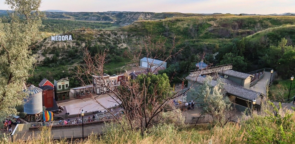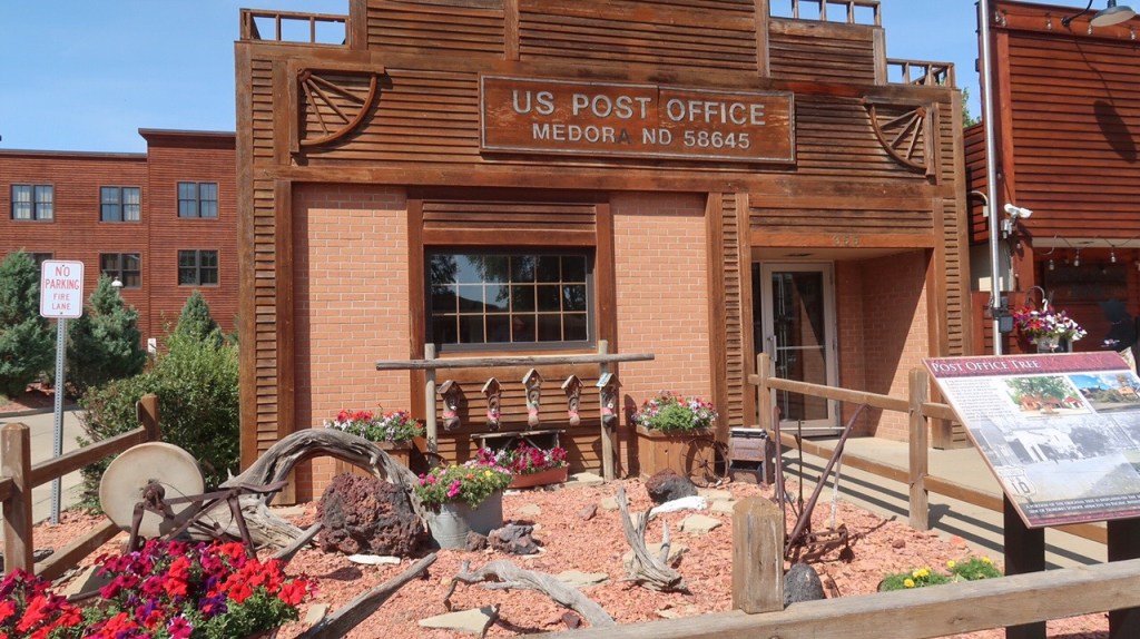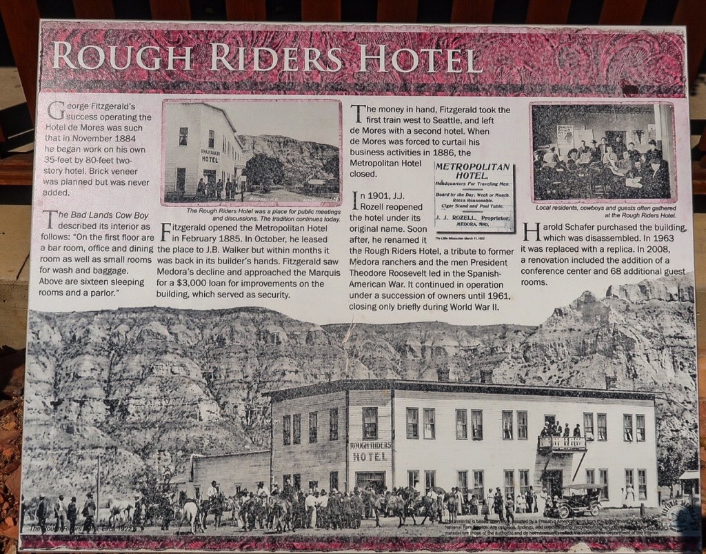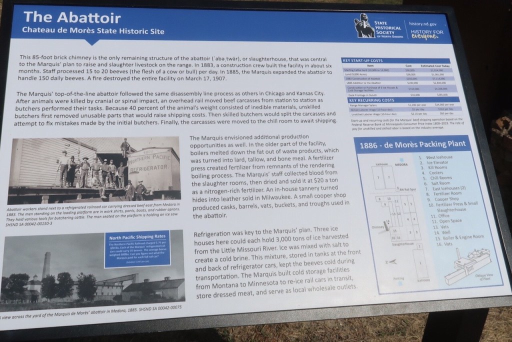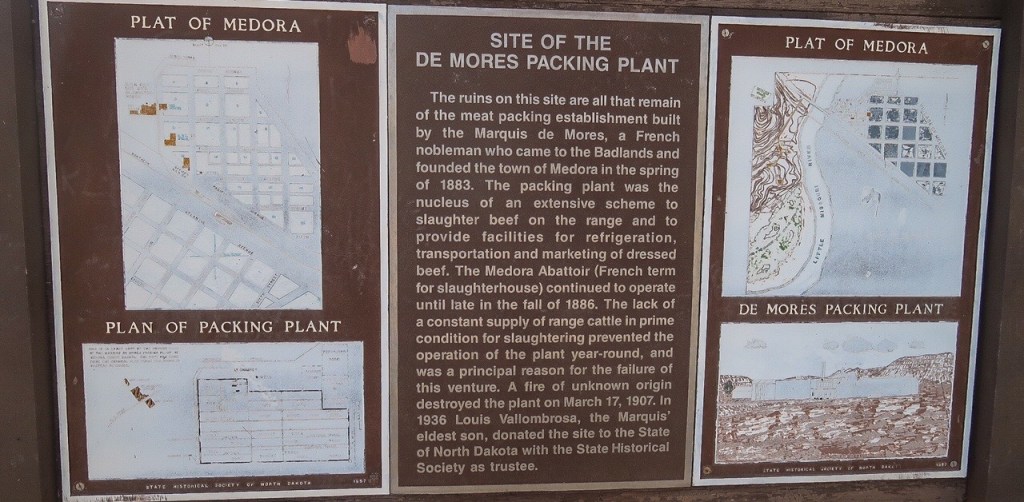 Medora is a quaint little town…population of 120….yup 120 people! It is surrounded by the Missouri National Grassland or Theodore Roosevelt National Park. Medora was founded in 1883 along the transcontinental rail line of the Northern Pacific Railway by a French nobleman Marquis de Morès who named the city after his wife Medora von Hoffman. He built a meat packing plant/slaughterhouse, or abattoir, where cattle and other livestock could be slaughtered, dressed and loaded onto refrigerated rails cars & shipped to markets in the east. All that stands now is the chimney, boiler and some foundations bricks. He built their house named the Chateau de Morès, which is now a museum.