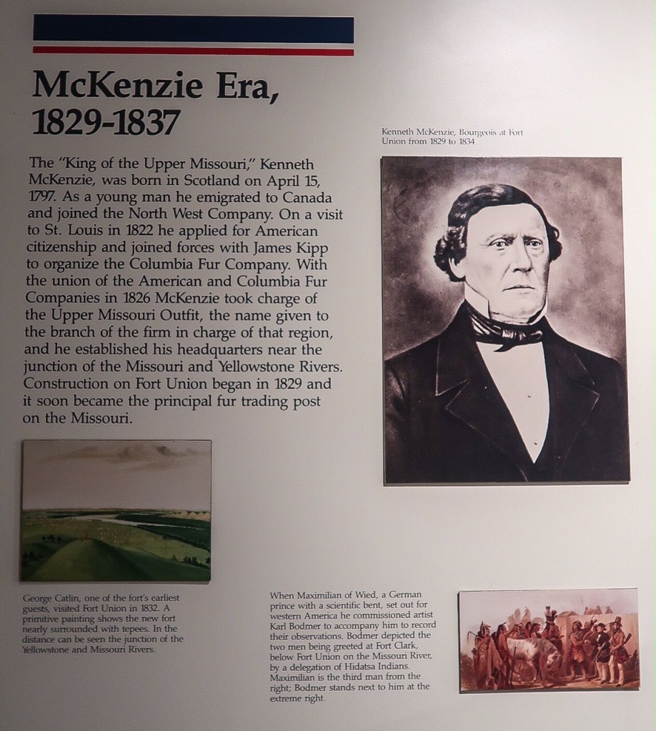 Fort Union, possibly first known as Fort Henry or Fort Floyd, was built in 1828 or 1829 by the Upper Missouri Outfit managed by Kenneth McKenzie. Fort Union was the central, and busiest, trading post on the upper Missouri, instrumental in developing the Fur trade in Montana for 39 years. The Assiniboine, Crow, Cree,Ojibway, Hidatsa, Blackfoot, Lakota and Mandan traded Buffalo robes, animal furs, meat, corn, beans,and other materials. There was a market in manufactured beads, clay pipes, guns, blankets, knives, cookware, cloth, and alcohol.