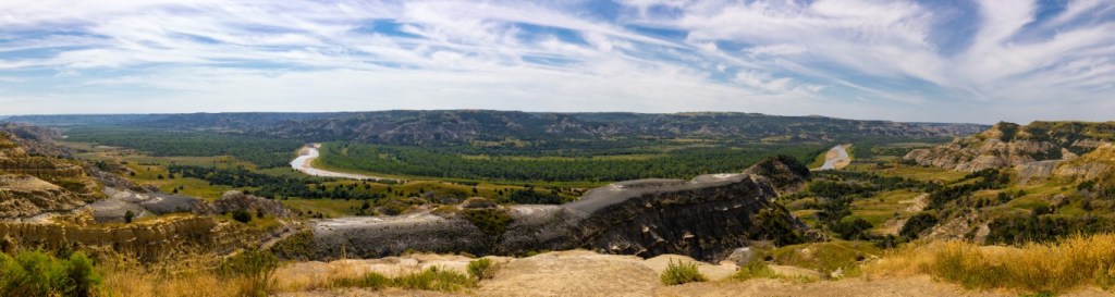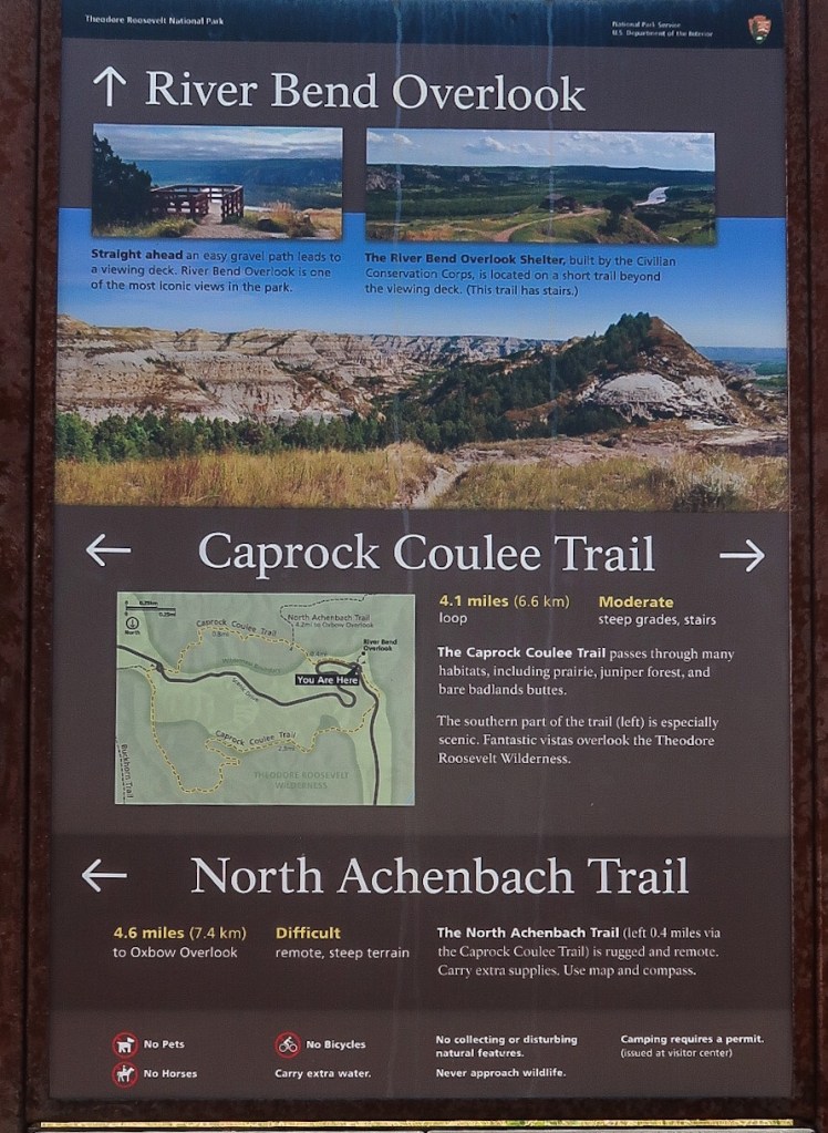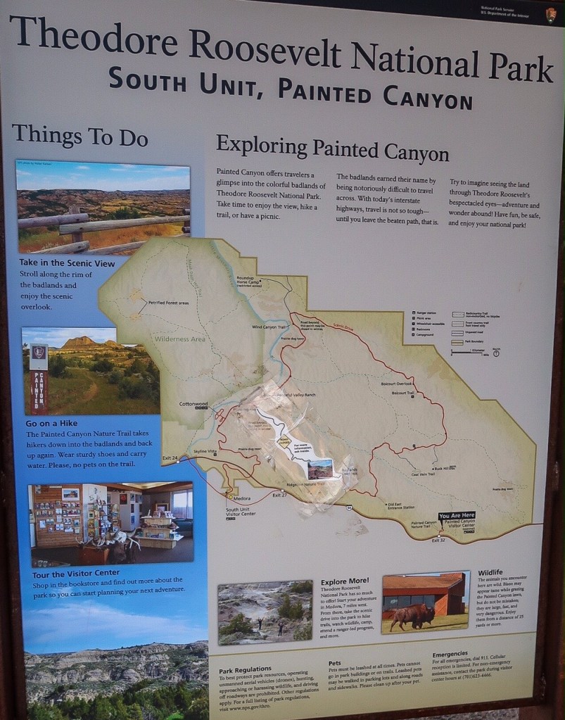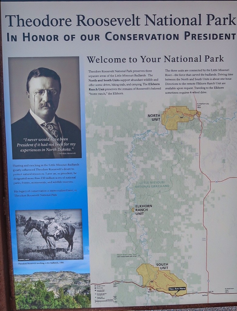 🦬 Theodore Roosevelt National Park is an American national park of the badlands in western North Dakota. Honoring US President Theodore Roosevelt, it is the only American national park named directly after a single person. The park covers 70,446 acres of land in three sections: the North Unit, the South Unit, and the Elkhorn Unit. The Little Missouri River flows through all three units of the park. The Mah Daah Hey Trail connects all three units. The park’s larger South Unit, where we are staying at Cottonwood campground is off I-94 near Medora, ND. The smaller North Unit is situated about 80 mi north of the South Unit, and Roosevelt’s Elkhorn Ranch is located between the North and South units.