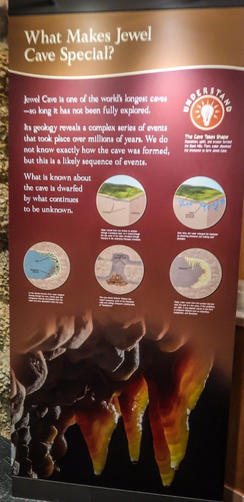 🥶 Brrr… 52* at 7am … 67*in camper at 8am! Enjoyed making breakfast inside today. It’s August & we just put on jeans, long sleeve shirts & carrying jackets, that’s because today’s adventure involves a colder cave! ❄️❄️ We left at 9 for our 9:30 checkin for our tour of Jewel Cave.