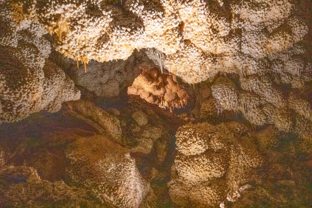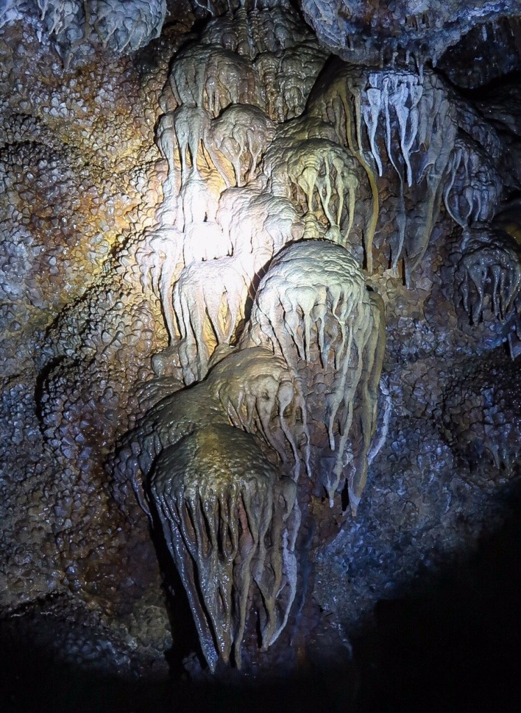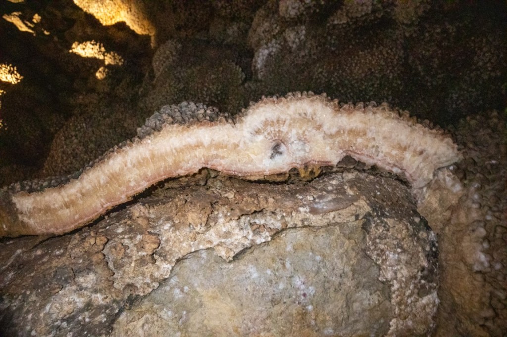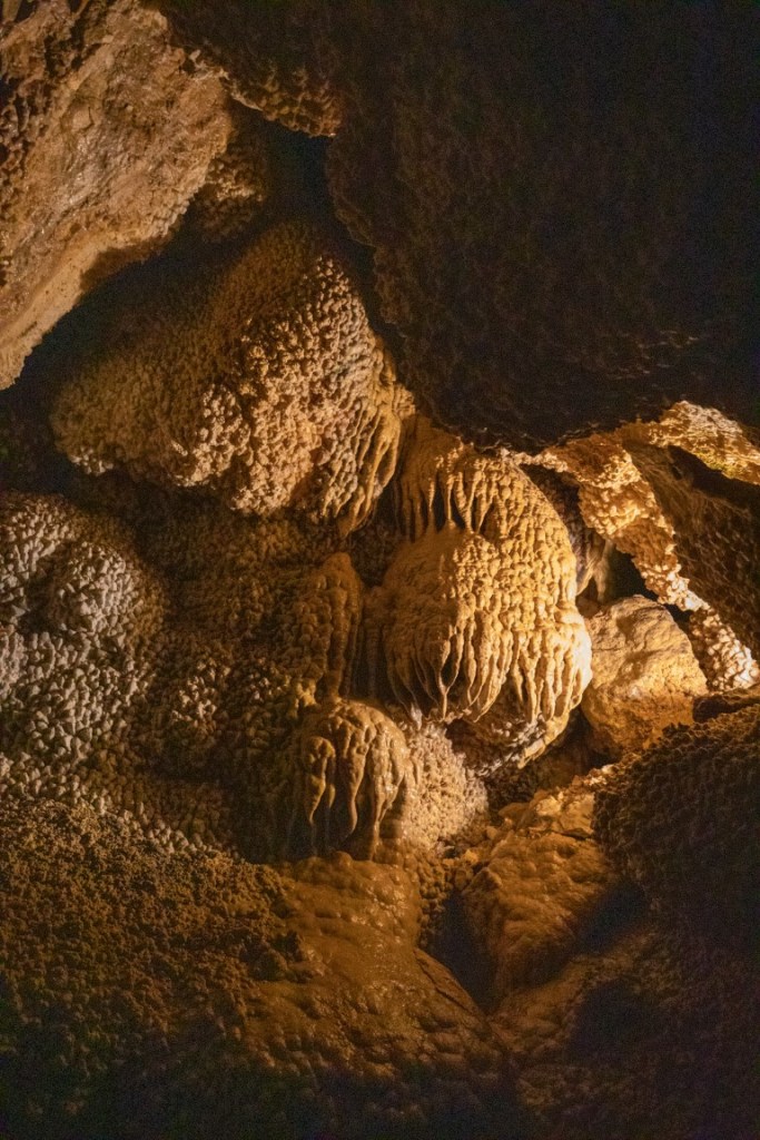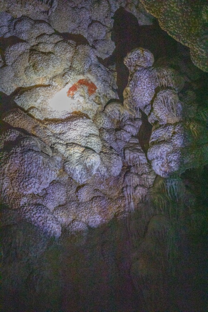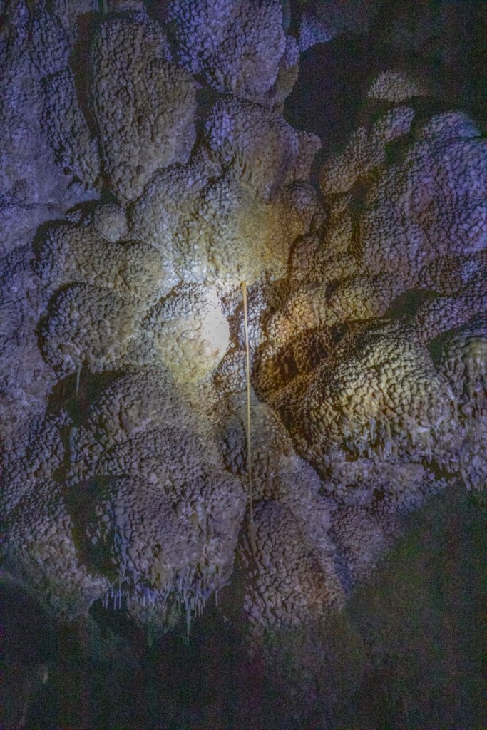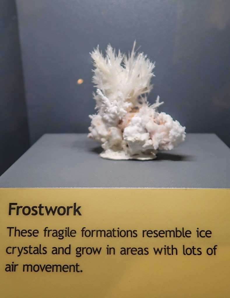 During cave development and afterwards, speleothems & speleogens formed, including the “jewels” or spar. We also saw stalactites, stalagmites, flowstone, cave popcorn, boxwork (like in wind cave), Draperies (looked like jellyfish), frostwork & gypsum flowers! And more but I can’t remember all the names of them! 😮 We saw a very rare formation called a hydromagnesite balloon. Those are created when gas of an unknown source inflates a pasty substance formed by the precipitation of the magnesium carbonate hydroxide mineral. We also saw a large formation of Cave “Bacon” (flowstone), a 6 ft piece! We finished about 12:20pm.