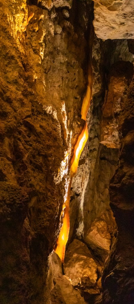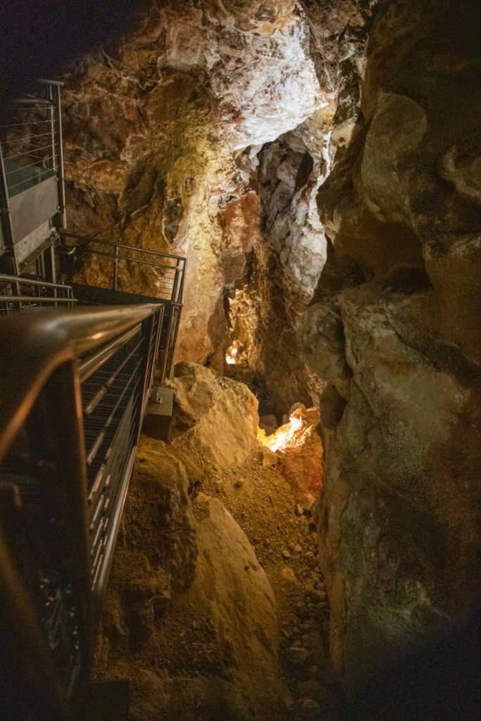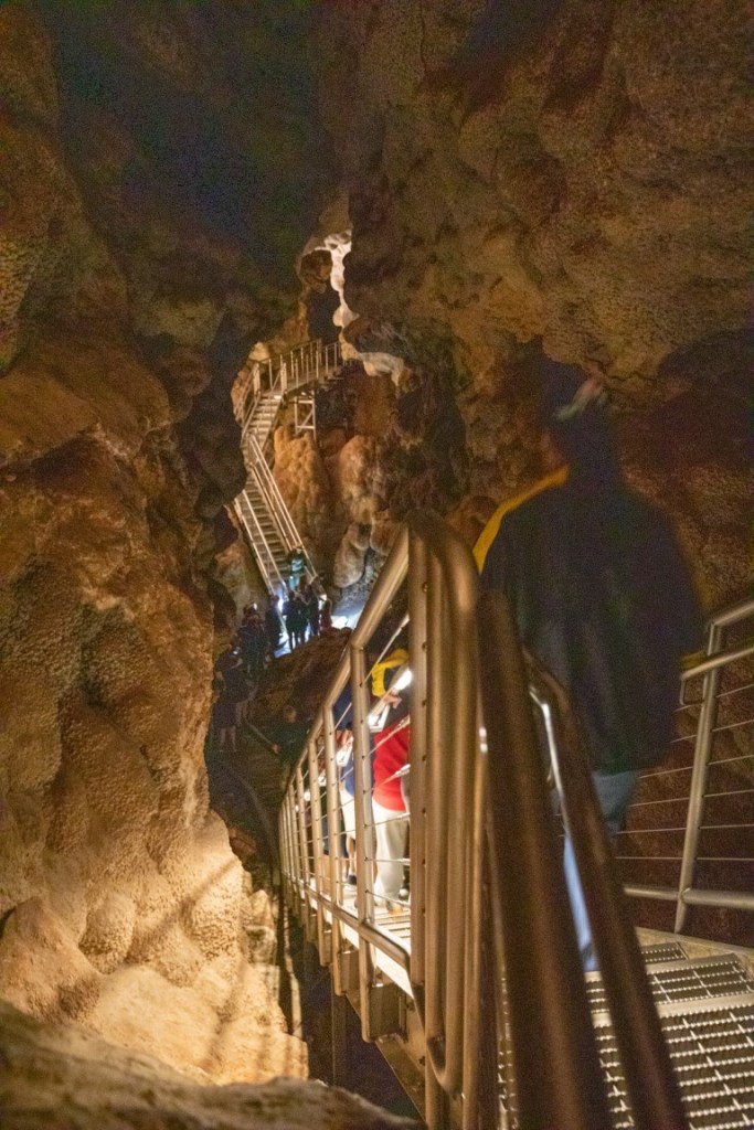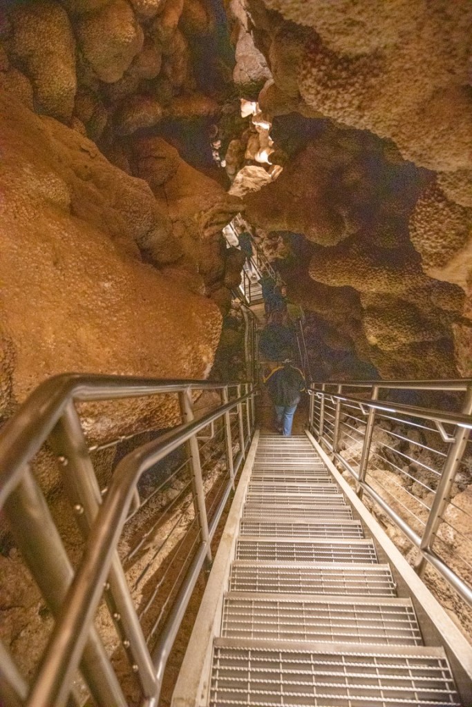 Jewel Cave is in Jewel Cave National Monument which is currently the 3rd longest cave in the world, with 209.32 miles of mapped passageways. It’s 35 miles from Wind Cave! The elevation ranges from 4,740 ft to 5,408 ft above sea level, 668 ft from the lowest to highest point. The deepest point in the cave is 749 feet below ground. Time for our tour! It’s 49* inside the cave! A constant temperature. Down 379 steps down we go!