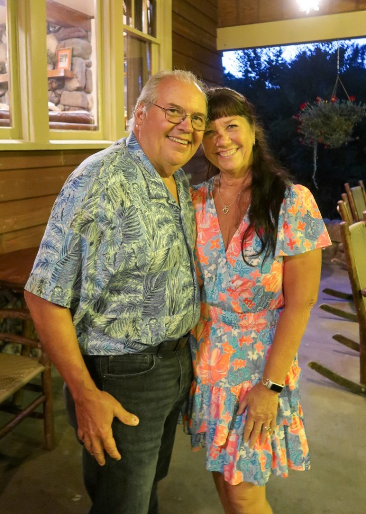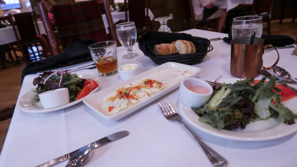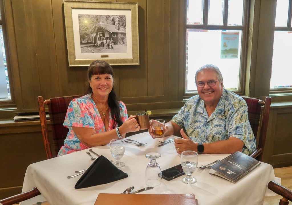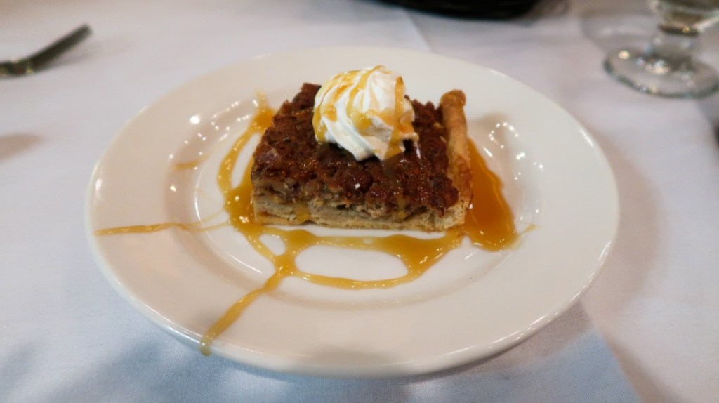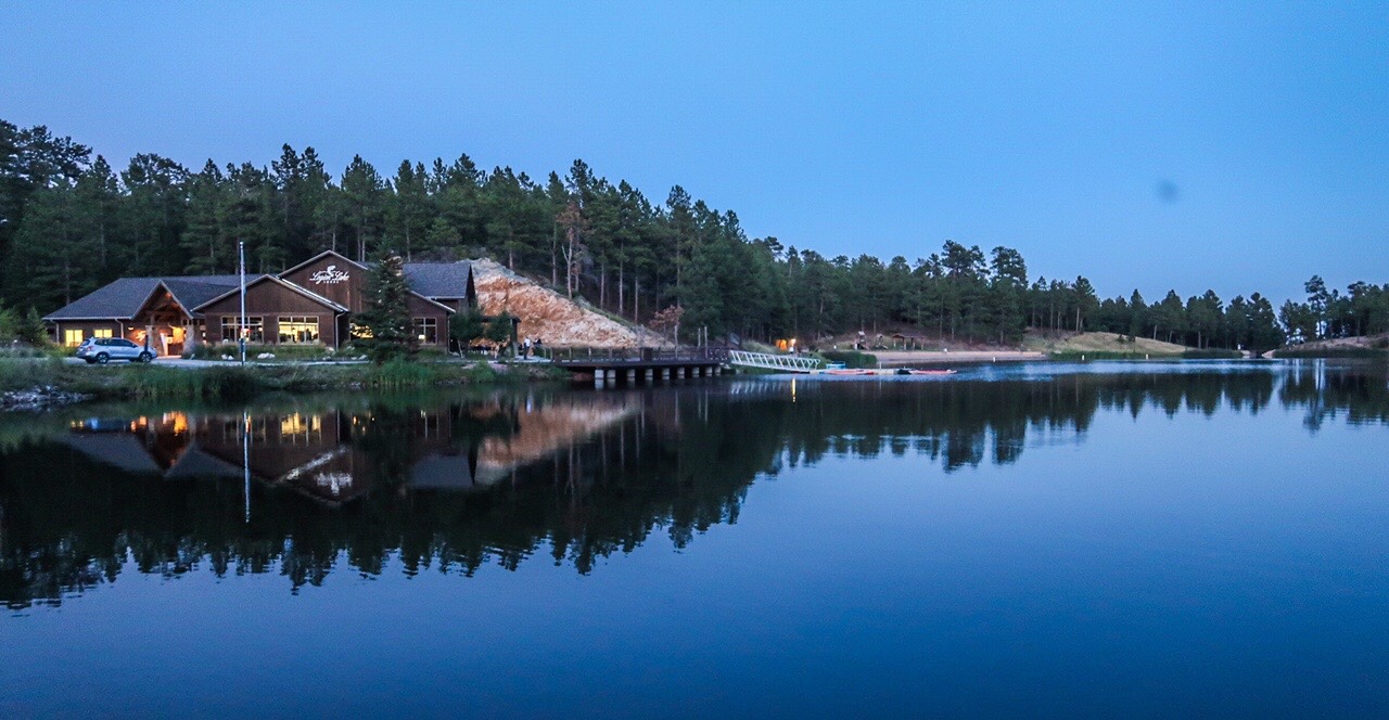 Across the street was the General Store. We browsed but nothing intriguing! What was cool was outside… old time gas pump that was functional. Only regular unleaded available. So back to the campground. Walked across the street to the Legion Lake Lodge. We took the hike around the lake, then walked back across the street to Ruby. Relaxed about 30 minutes and started getting ready for dinner. 🎉🎊🎉 Super excited to get dressed up & go out to dinner!! 😊 We arrived at the State Game Lodge early and good thing we did for a wedding was happening on the lawn. 💕 Sat at the bar for Happy Hour and then at 6:30 we were seated at our table. Started with Buffalo Ravioli, covered with Black Truffle mushrooms & Parmesan cheese. Used the bread to soak up the delicious sauce. Tim ordered Elk Osso Bucco, slow braised elk shank, smoked Gouda risotto wild mushroom & burgundy brown sauce with veggies and a Caesar salad. I started with a salad with amazing cranberry vinaigrette dressing then Walleye with wild rice, tomatoes and caper beurre blanc with veggies! OMG can you say phenomenal. But wait I had to try dessert… Salted Caramel Pecan Pie! Such a magical night we had! We always try to experience dinner at a historical restaurant at least once o trip and we were not disappointed! That’s a wrap for today! Good night! 😴