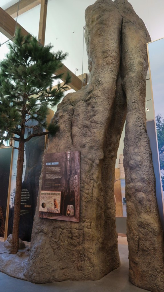 The Peter Norbeck Visitor Center was our next stop. The inner child came out here for this was such a great educational building…inside & out. The interior is designed to encourage children and families to explore the unique ecosystems within the park while the exterior Outdoor Classroom is a chance for unscripted play. “The Civilian Conservation Corps built the Peter Norbeck Visitor Center as the park museum during the winter months of 1934-35. The young men of Camp Lodge, ages 17-25, created a structure that blends into the surroundings. They used their talent in construction and native materials of logs and rocks to create a building to educate the public on the parks natural and cultural history. Interpretive exhibits and displays allow visitors to gaze into the eyes of a 1,900-pound bison or witness tree rings dating back 330 years. Displays reveal much about the history of the area, from Black Hills geology to the efforts of an 1876 gold panner”.