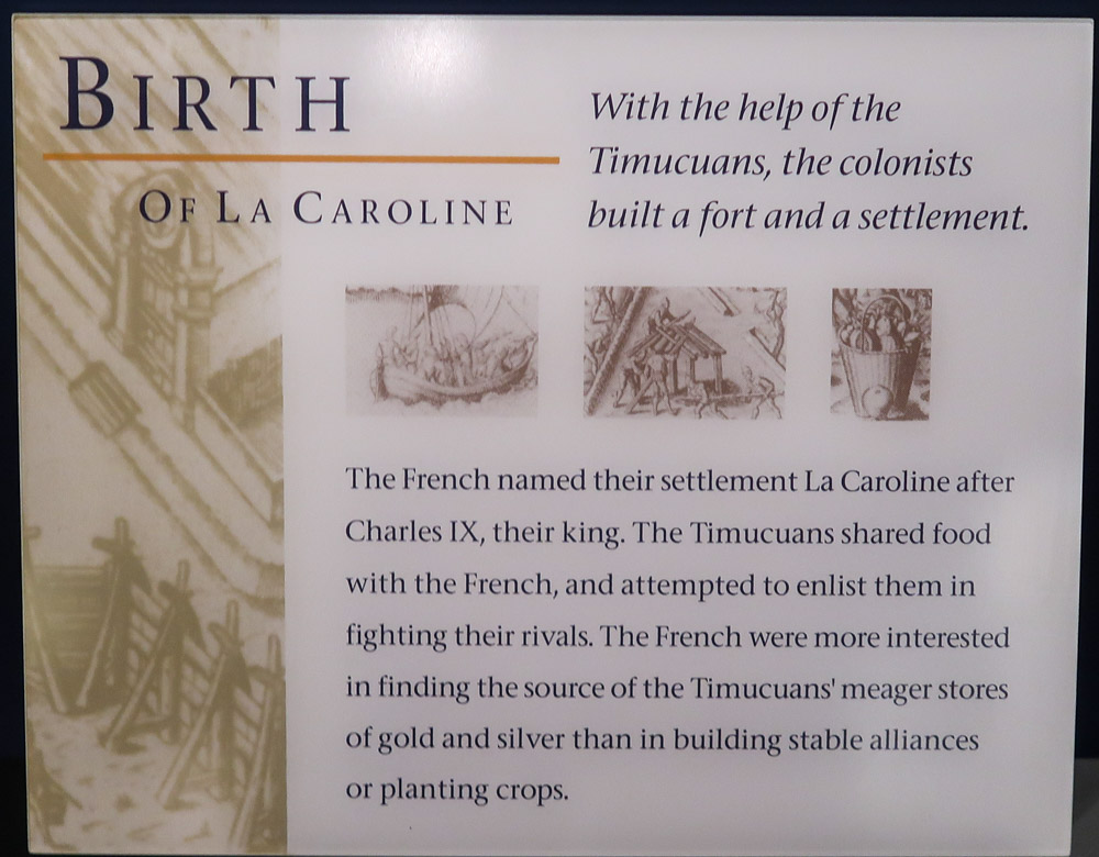 Fort Caroline was an attempted French colonial settlement located on the banks of the St. Johns River in Duval County. It was established under the leadership of Rene’ Goulding de Laudonnie’re on 22 June, 1564. Helped by the Indians, they built the fort and a village naming it after their king, Charles IX. The French colony came into conflict with the Spanish, who established St. Augustine in September 1565, and Fort Caroline was sacked by Spanish troops under Pedro Menendez de Aviles on September 20th. The Spanish continued to occupy the site as San Mateo until 1569.