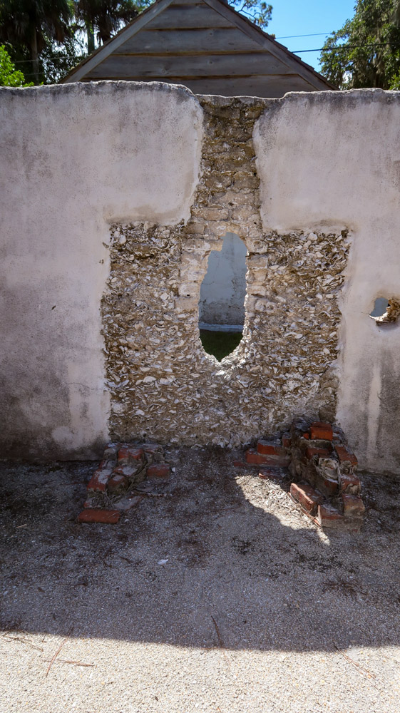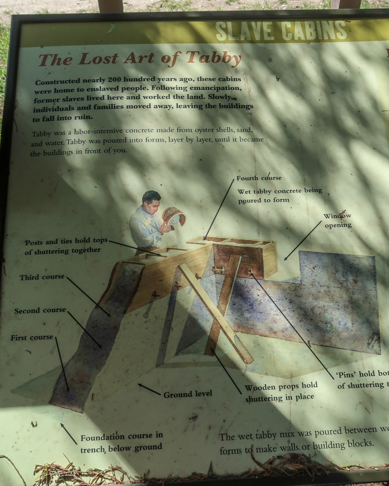 Tabby like concrete was made from cooking oyster shells in kiln for lime. The cooked shells dissolved in water, and sand was mixed in to make “concrete” which was then poured into forms and then layered to make the walls.