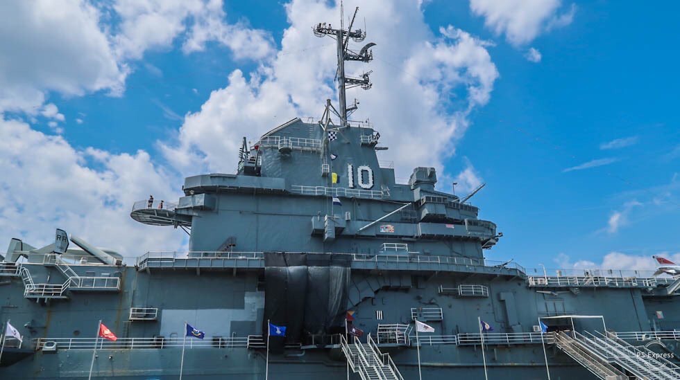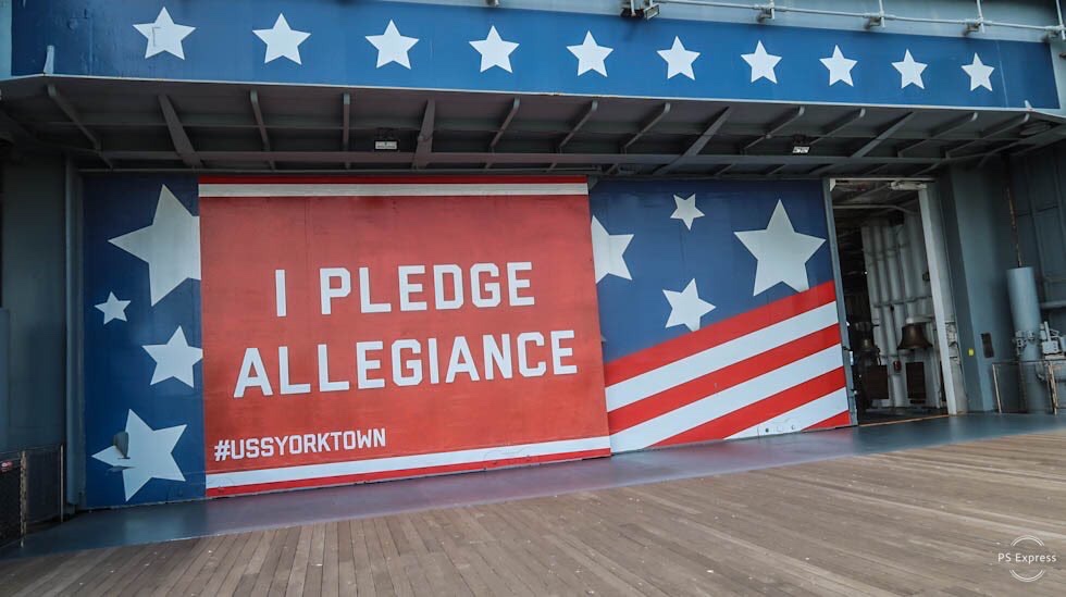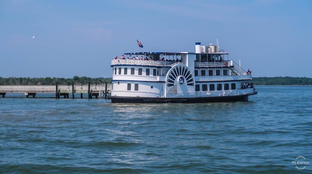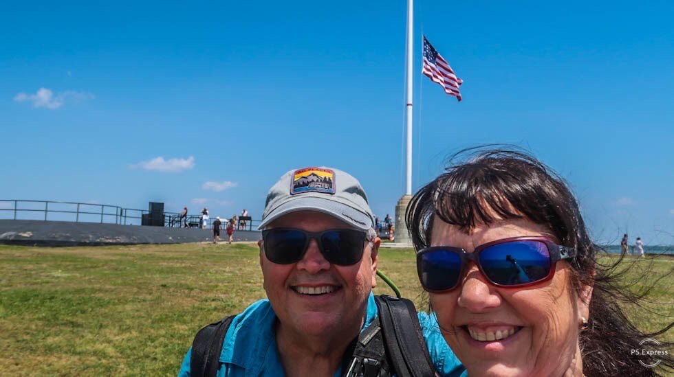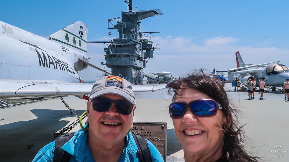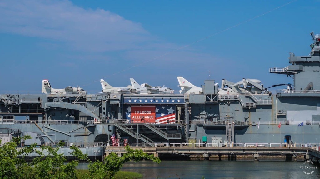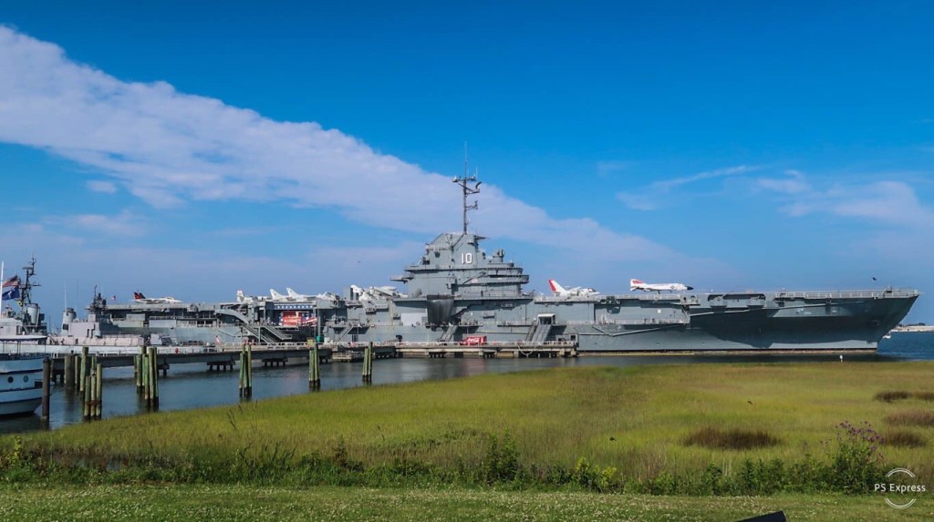 ☀️Up at 7:30am – 76* with a high of 89*. 🥣 Breakfast of champions…oatmeal! 🤦🏻♀️ Remember all that free tea we had yesterday….well all that caffeine kept me awake till 2:30am even with a sleeping pill! 9 am – Leaving for another adventurous day! Arrived at Patriots Point at 9:45. $5.00 to park. We bought the combo tickets so we walked around the grounds & the gift shop till it was time to board the boat.🛥️ The joke of the day was that we were with the tour group from a cruise Holland America ship …. They made us wait to board but then waved us through instead of scanning our tickets to board! 🤣 Saw a few dolphin pods along the ride. 🐬