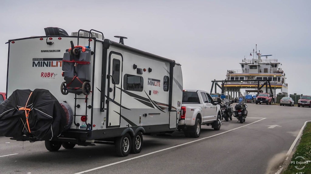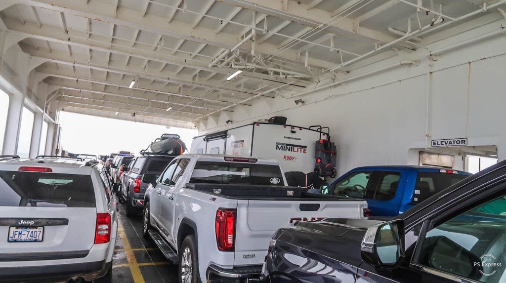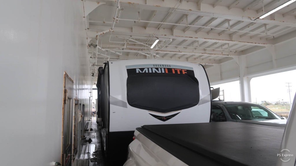 ⛴️ Here we go…. We’re in line 4 waiting for the ferry. This is so exciting! 35 years ago we went on a ferry with our Motorhome but this is a truck & travel trailer! 😱