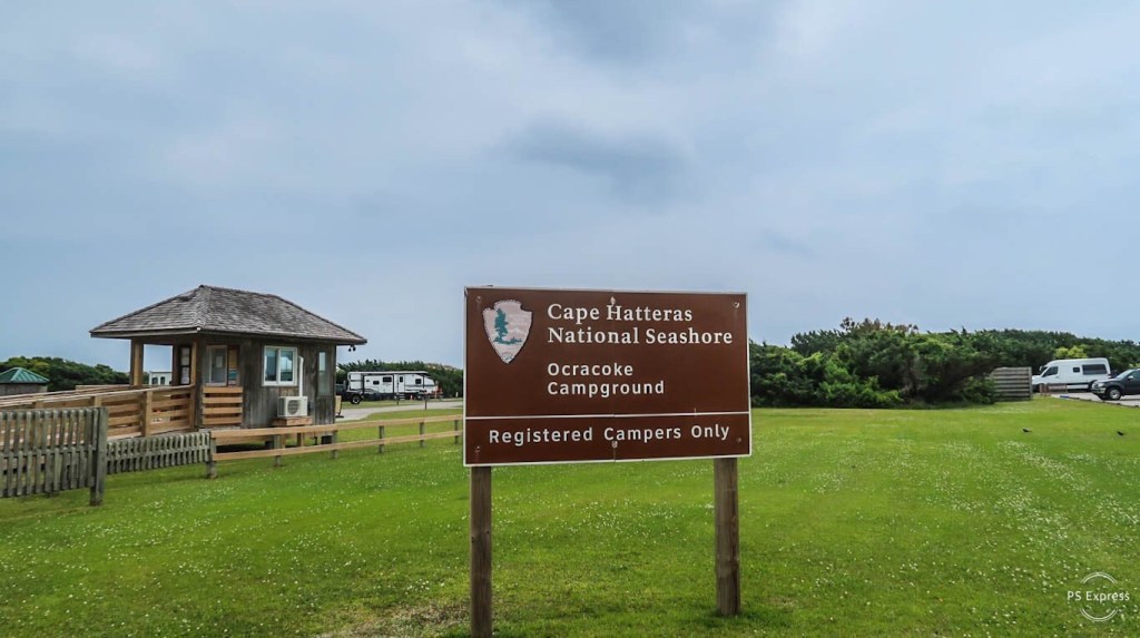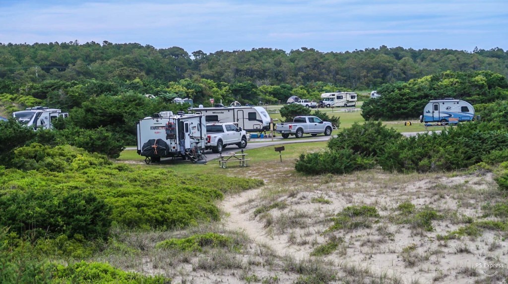 Ocracoke Campground has 136 sites. Sandy soil sites, no amenities, flush toilets & cold water showers! Brrr🥶 Our site backed up to the sand dunes which was a beautiful site! Cool breeze throughout our stay!