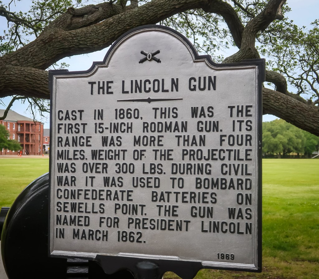 Although Virginia became part of the Confederate State of America, Fort Monroe remained in Union hands throughout the American Civil War (1861–1865). President Abraham Lincoln had Fort Monroe quickly reinforced so that it would not fall to Confederate forces. It was held by Union forces throughout the Civil War, which launched several sea and land expeditions from there. In 1861 the prototype 15-inch Rodman gun was delivered to Fort Monroe and was subsequently fired 350 times in testing. This weapon (Fort Pitt Foundry No. 1 of 1861) is displayed at the fort as of 2018; a plaque states that it was test fired for President Lincoln and was nicknamed the “Lincoln gun”. This type of weapon was deployed for coastal defense during the war (an 1862 map shows an external battery of them at Fort Monroe) and more widely deployed following the war. The fort was notable as a historic and symbolic site of early freedom for former slaves under the provisions of contraband policies.