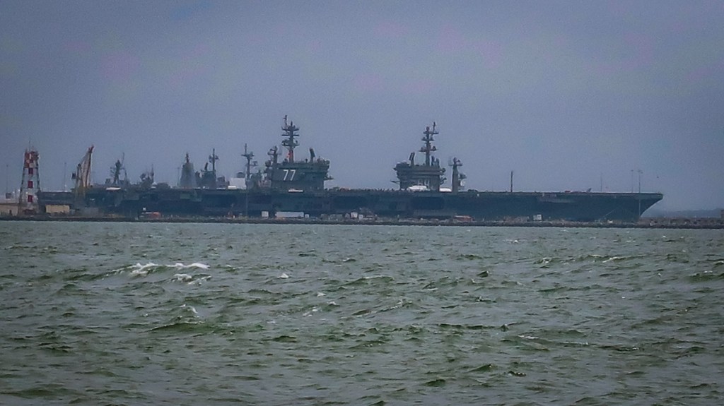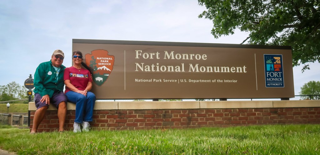 1pm we arrived at Fort Monroe National Monument. Toured the visitor center,movies and displays then headed over to the Oldest Fort in the US. Walked through the Bomb proof casements, saw the jail where President Jefferson Davis was for 2 years. Walked around the 1 1/2 mile top of the fort to the Flagstaff Bastion to the Old Point Comfort lighthouse, the Chapel of the Centurion (dedicated in 1858), the quarters where 2nd Lt.Robert E. Lee and his wife Mary lived and grounds. Went through the main gates which were constructed in 1820. It was cool out so we found the Firehouse Coffee Station…the Oldest US Army Fire Station in est. in 1881. Continued walking around the grounds and were just so amazed with this fort! Walked down to the water and across the harbor saw the George H W Bush, supercarrier.