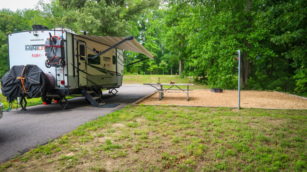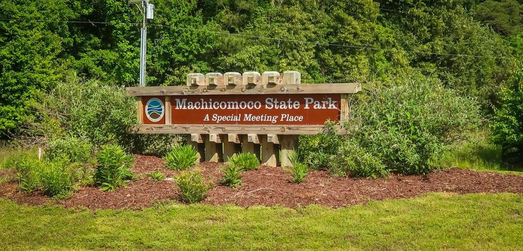 4:35pm We arrived at Machicomoco State Park. Set up at site #3, big beautiful pull-thru site. What a mess when we open the door of the RV!!!! Water was all over the floor, carpet wet and in the drawers under the kitchen sink. Apparently the water got knocked on.. due to the very bumpy roads and filled the sink which then trickled into and behind the drawers. Everything came out, cleaned and then fan placed inside to dry the rug. Then an Error 2 came up on our power management system and of course it’s after 5 and the office is closed, the camp host is gone so Tim called the ranger. Well he arrived and he’s not only the park ranger but also the policeman for the park. He said he gets to live for free having the dual title. He’d come back in am to replace the plug.