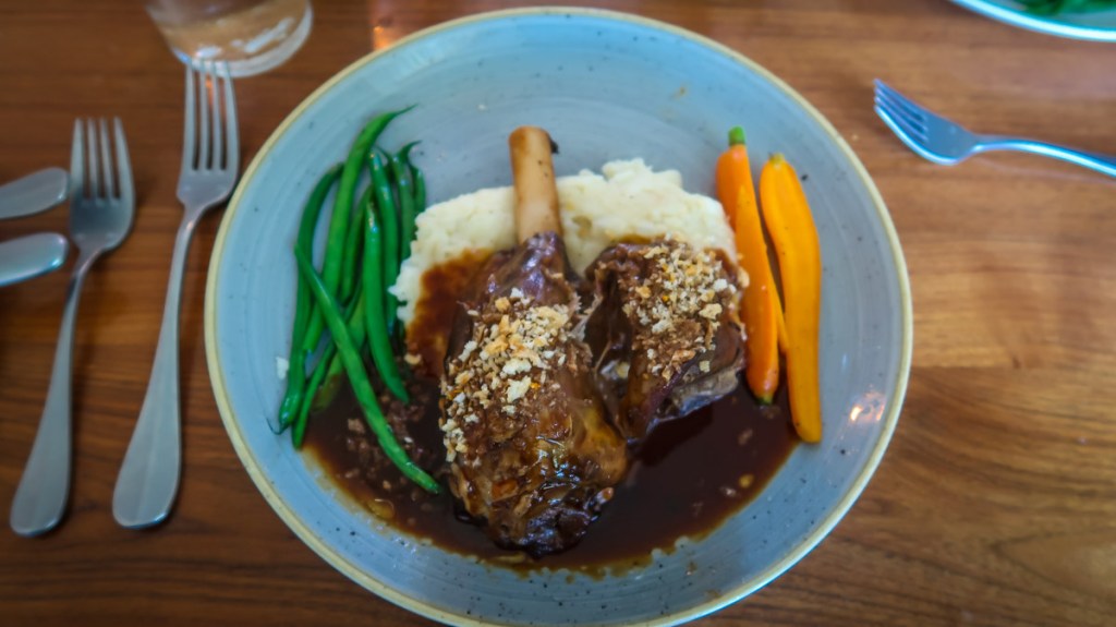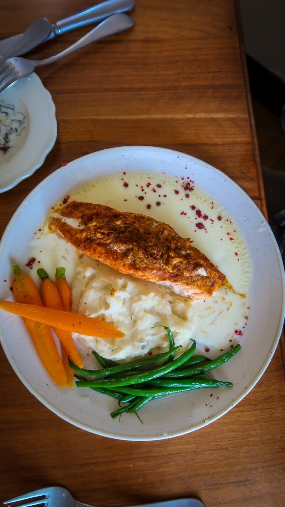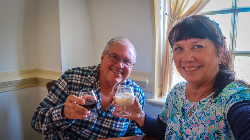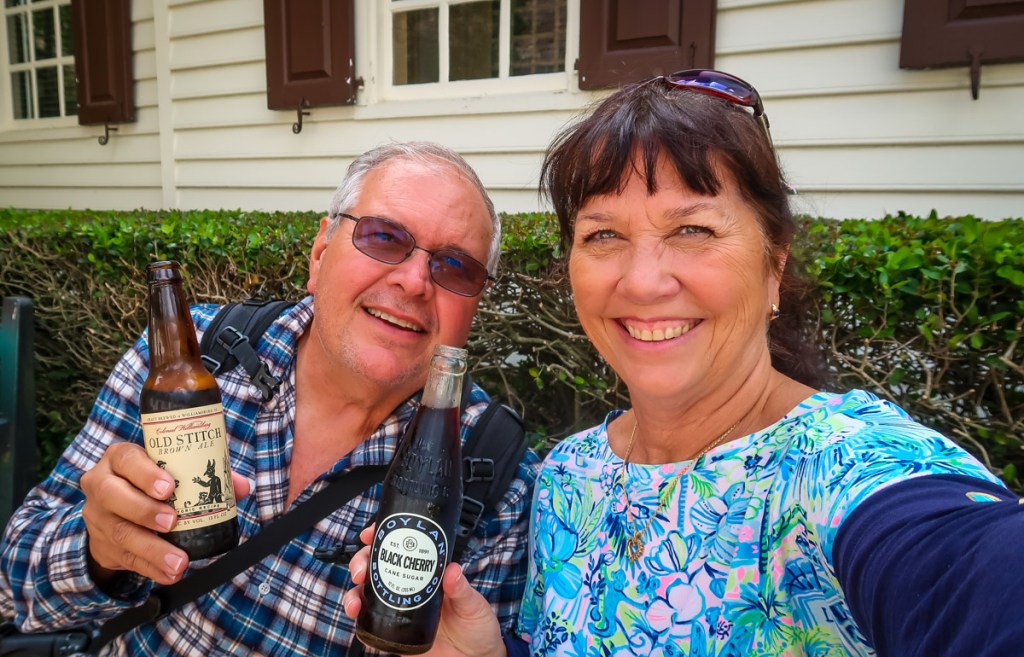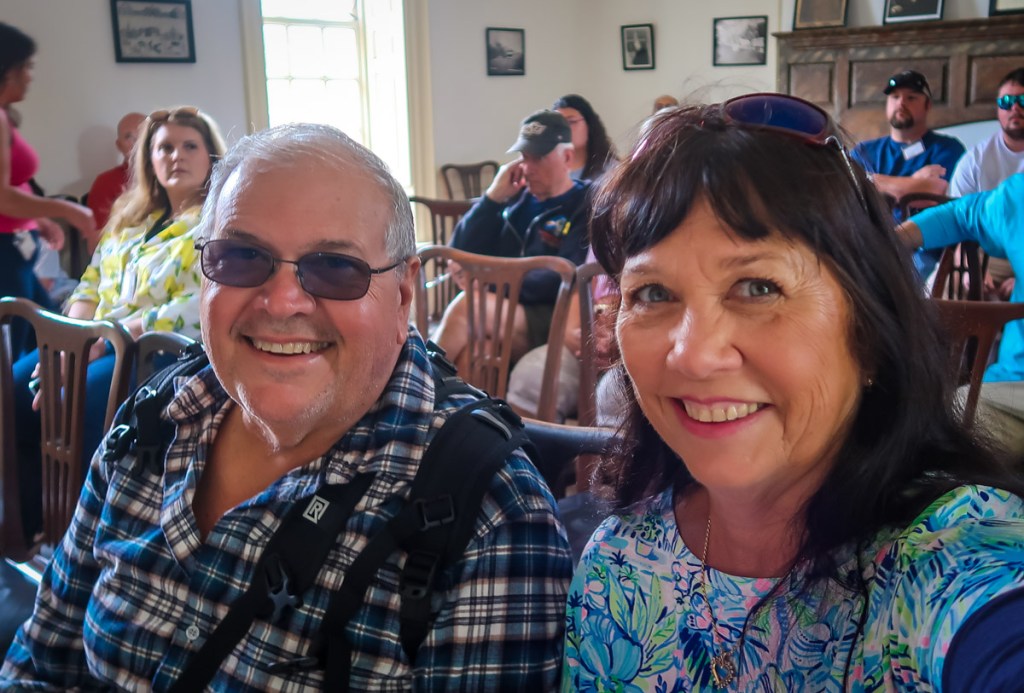12:30-3pm we watched the Grand March of Fife & Drum 🥁 🪈 groups from all over the US for a once a year performance. Each group marched down Capital Circle to Market Square then each took turns performing 3 songs on the Palace Green. Then we watched a presentation “Order in the Court” in the Courthouse, toured the Governor’s Manson and all the open houses we could tour. We tried some Queen’s bread (lemon cake with currents) a beer and a black cheery soda. Yummy! At 5pm we stopped touring and headed over to 🛡️ The Kings Arms Tavern for our dinner reservation. We were greeted outside then walked up to the Blue room on the 2nd floor. Beautiful table setting with pewter candlesticks on the table and the dishes all had the coat of arms on them. We enjoyed a cocktail, with warm bread served with 3 spreads…corn/ham relish, ham salad & whipped butter. Shared a corn chowder soup which was amazing. For our entrees, Tim had crab stuffed Salmon and I tried the lamb. 😱 The waitress was surprised I ate it all but I purposely didn’t eat since breakfast because I knew this was going to be amazing. On top of that, something we never do …we ordered an after dinner drink and split a bread pudding.