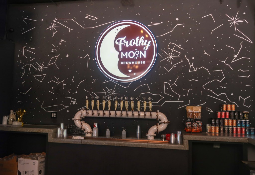 🍻 Frothy Moon Brewhouse – Opened in October 2022, “All of our coffee begins with farm owner Alfredo in Ecuador”. The brewhouse features a variety of coffee and tea beverages at its coffee bar, as well as its own line of beers available from the tasting room in cans and on tap — there is even a root beer available for those under 21. There is an extensive outdoor patio an large outdoor back covered pavilion, fire pits and large field for kids to play & for food trucks. They refer to customers as “ crew members”! The atmosphere is all “ Space” 🪐 ✨ 🌌