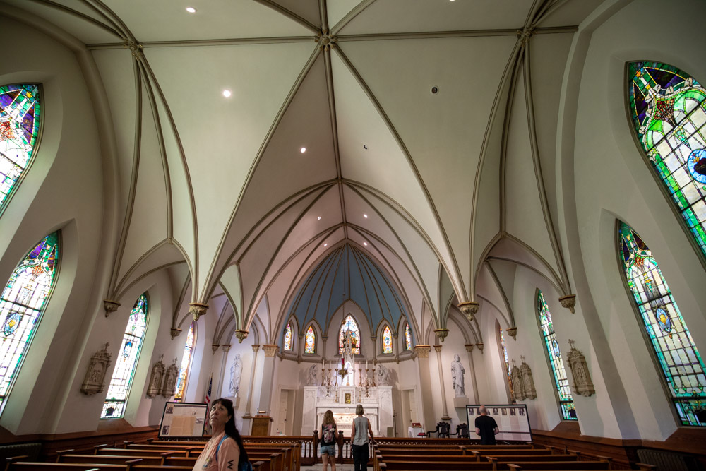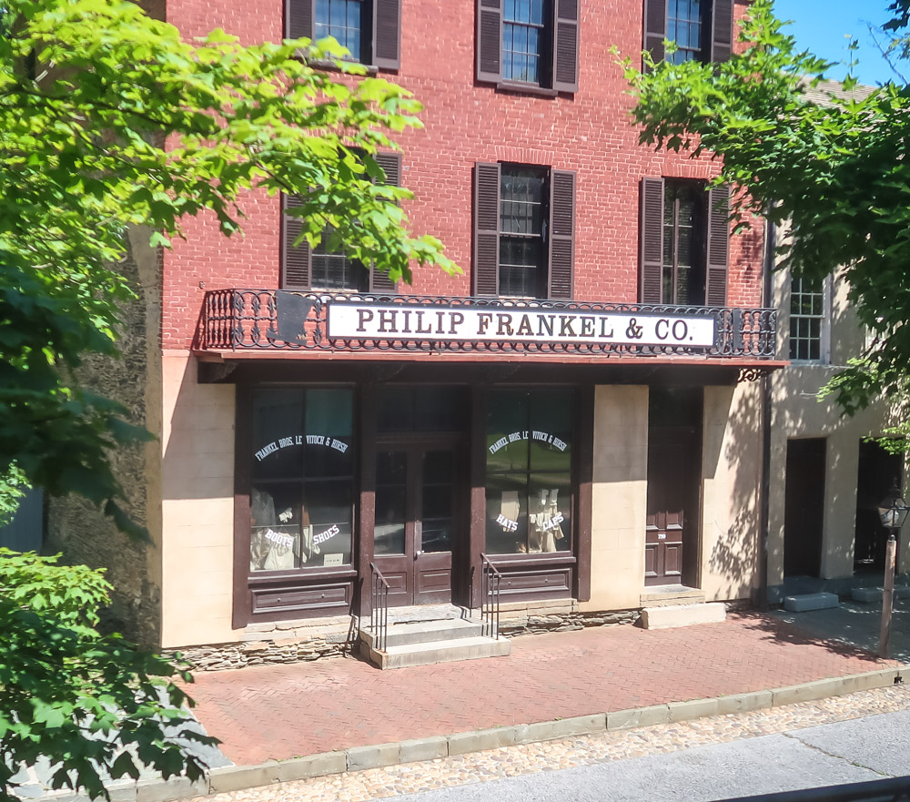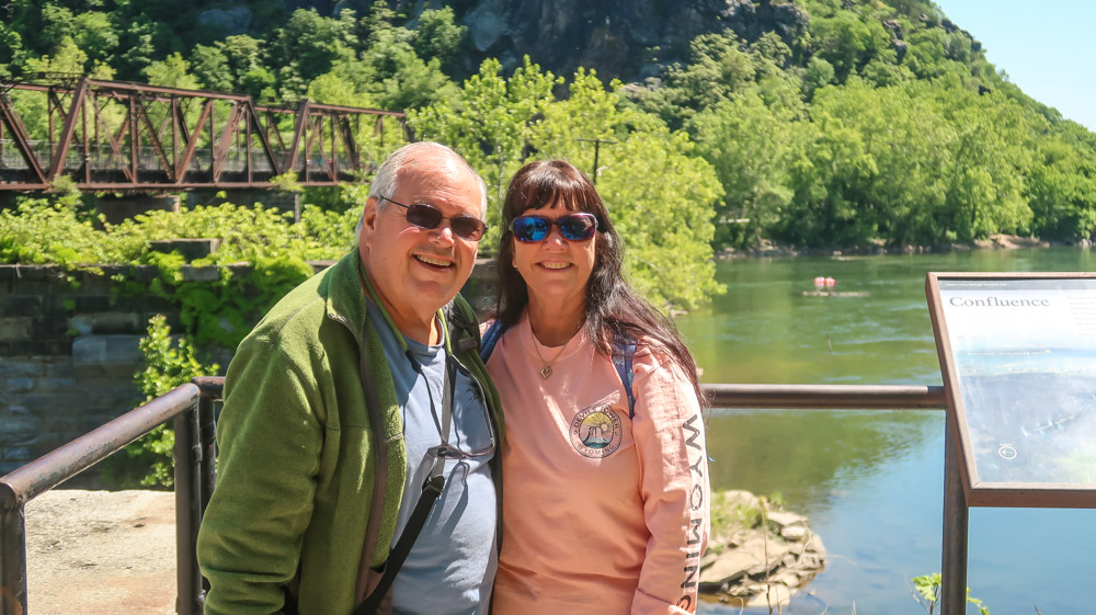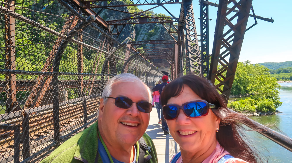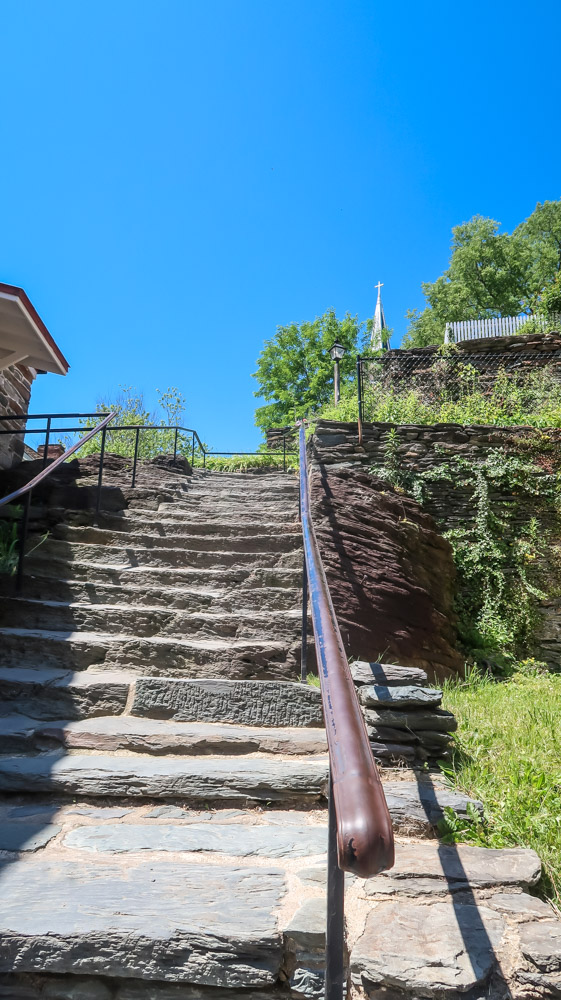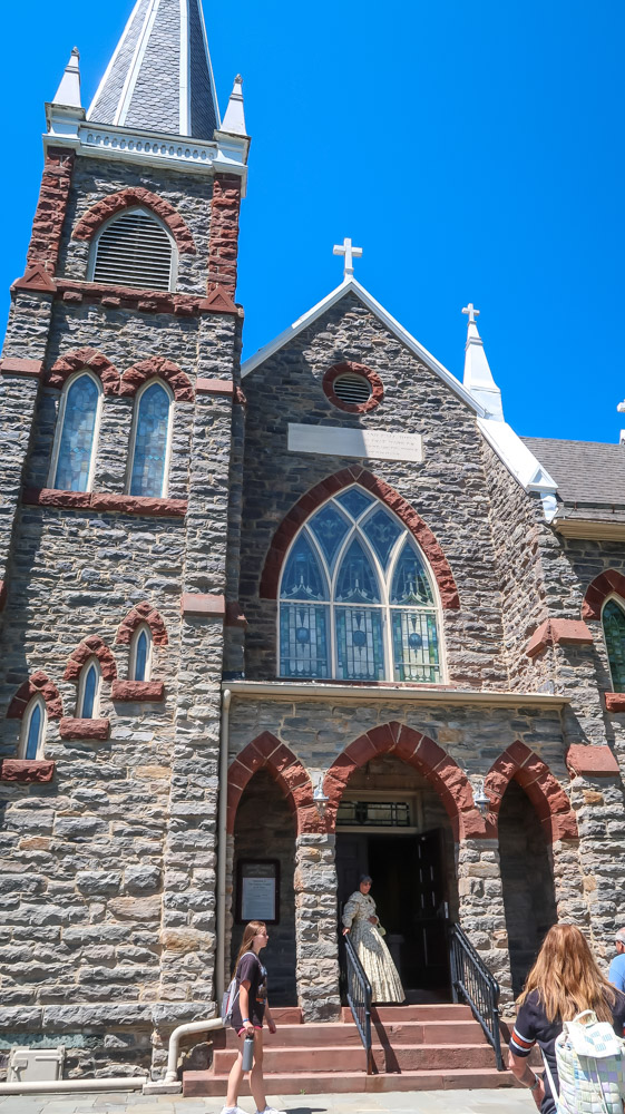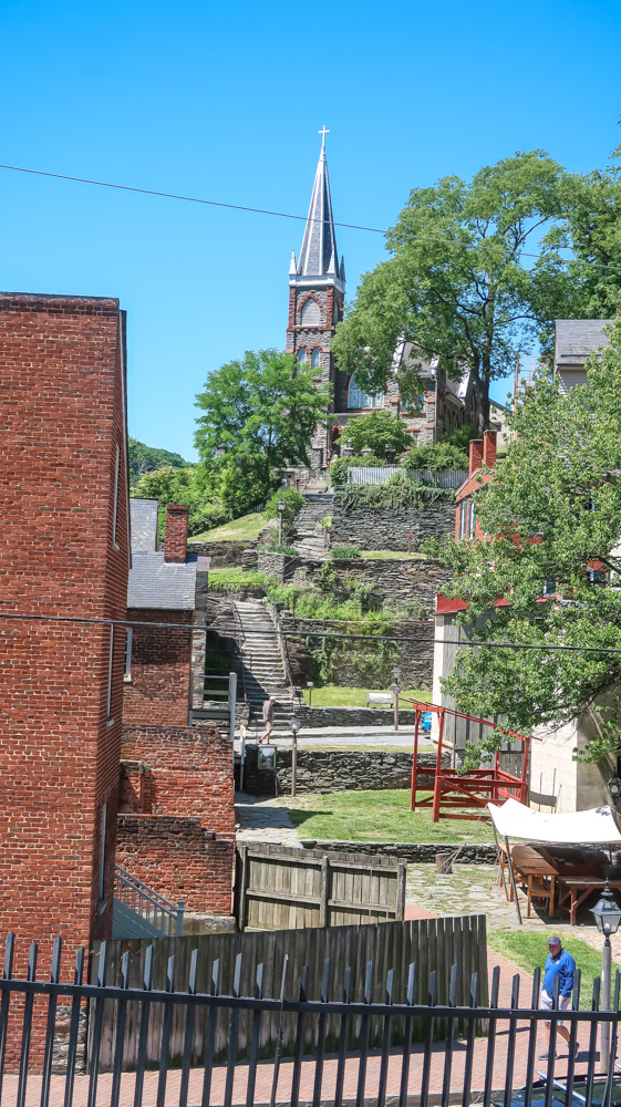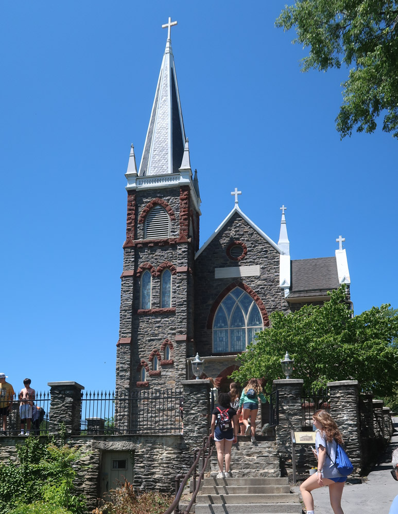 10:30 am 1st stop Harper’s Ferry. What a big surprise to us for when we walked inside the visitor center, you take a shuttle a bus to the downtown area! We walked in and out of all the old buildings, about 100 ft of the Appalachian Trail and went down to the water where we stood on the corner of Va., W.Va., & Maryland! Cool old train station which was still functioning. We watched as passengers boarded an Amtrak and as a freight train went by. Went inside the Historical Chapel of St. Peter. Father Costello was the Pastor several months before John Brown raided the Federal Arsenal at Harper’s Ferry. It survived the Civil War. The windows were installed about 1898. Robert Harper was given a land grant of 125 acres by Lord Fairfax. When he died, he left a provision in his Will in 1782 dedicating 4 acres of his land to church construction or community buildings.