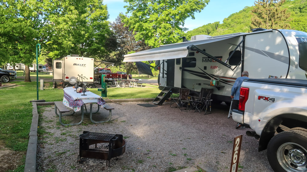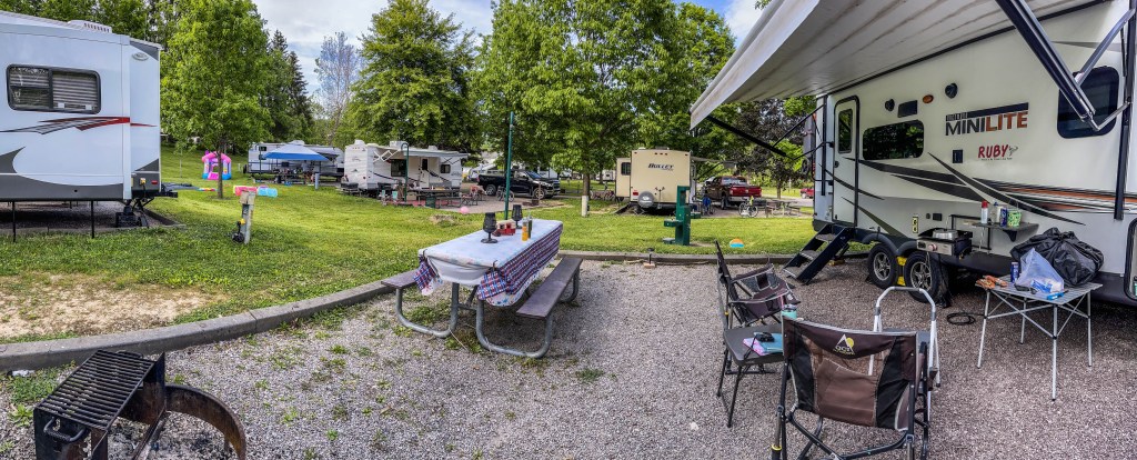 Headed to our COE Park now. Crossed over into Pa at 5:18pm. Arrived at Outflow COE Campground at 5:45pm Oh my…. Properly named because it was overflowing with people…..doesn’t help it was a holiday weekend too! And right by the community water faucet too! 💦 We set up the RV…..took a walk all around the campground, over by the hydro power plant then we drank too much as we relaxed for the night! Oops 😬 🤣🤦🏻♀️ Good night all. Till tomorrow’s adventures! 🛌 💤. 237 miles for today
