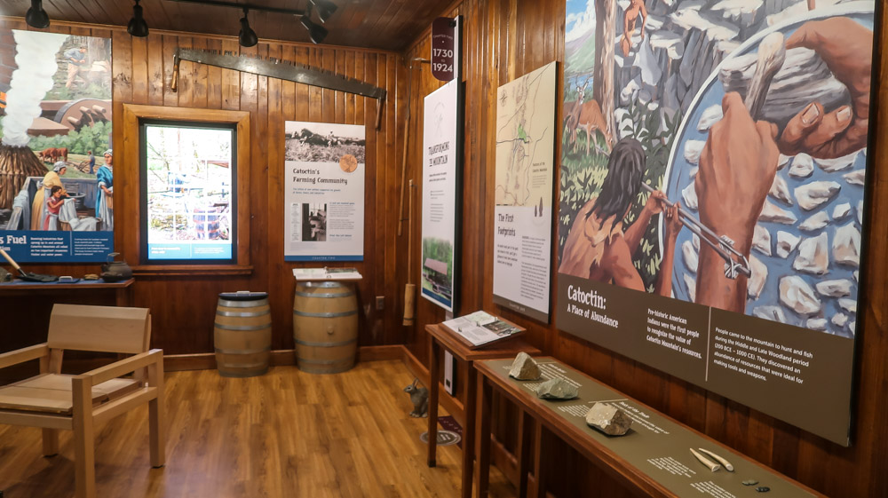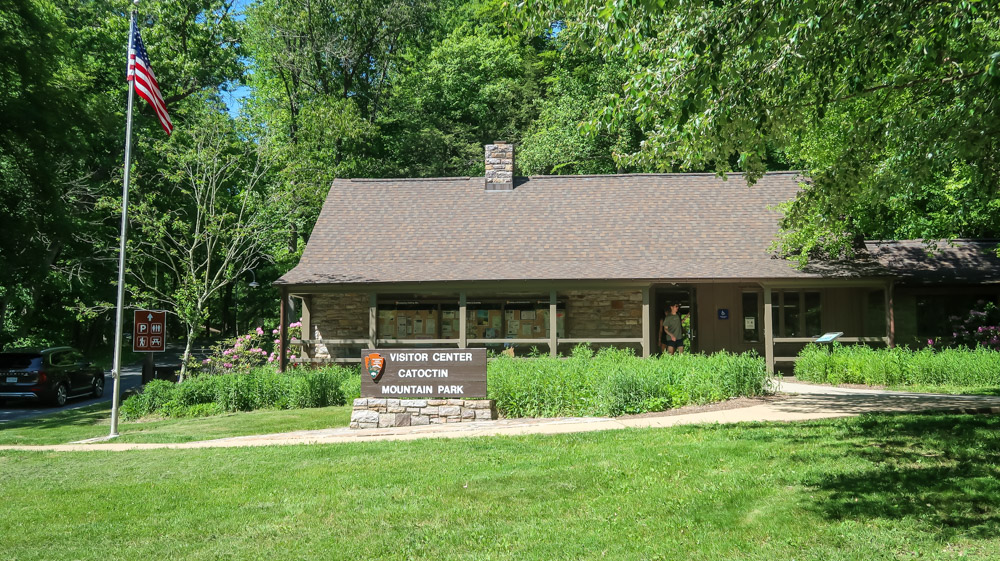 2:30pm 3rd stop of the day was even more challenging! Catoctin Mountain Park. Pulled in and no parking in front of the visitor center so we proceeded into the park thinking we’d find another parking lot! NOPE! Drove to the back of the park where it took 10-15 minutes of backing up and maneuvering to turn around. Finally a ranger asked where we were trying to go and told us we might be able to find a spot now up front. In the parking lot there had been a tree that came down on someone’s car and that area was all blocked off so once again with little area to turn around, Tim got us situated. We toured the exhibits in the visitor station and talked with 2 of the rangers for awhile. 😔 Sad to learn that the areas around Cunningham Falls SP were not passable with RV’s. So we had to pass on these adventures!