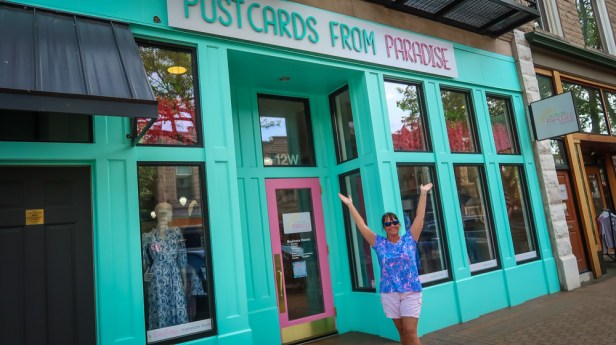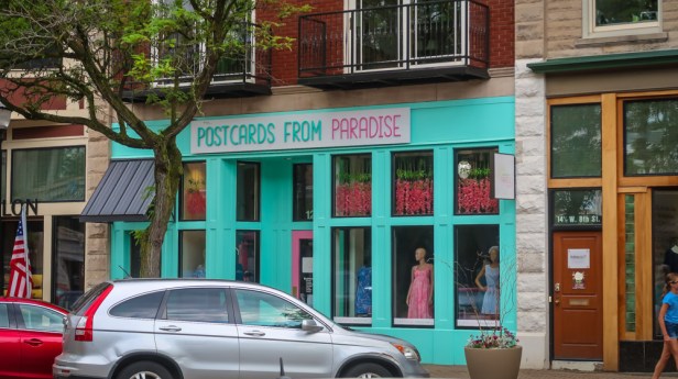 Postcards From Paradise ~ comes from the shop owner’s life experience traveling. Katy Heston and her husband lived abroad in Europe and enjoyed spending their off time traveling to places like the Amalfi Coast, The French Riviera, and the Greek Isles. She created a store that can transport people to a completely different place without leaving West Michigan. The store has different themes for the fitting rooms and design/decor accents that are reminiscent of her time traveling through Europe.Postcards From Paradise carries a special brand of clothing called Lilly Pulitzer. The brand brings people together from all over the world with a mutual love of bright clothing and a resort lifestyle.
