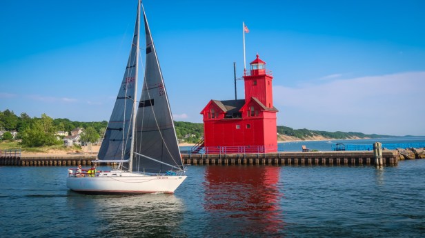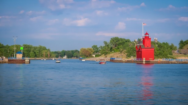 Bid Red Lighthouse – built in 1872 stands 32’. at the entrance of a channel connecting Lake Michigan with Lake Macatawa. The first light keeper was Melgert van Regenmarter, appointed to service in 1870 at an annual salary of $540.00. He served until just prior to the steam fog signal going into operation. It is said that he wanted no part of the new technology.