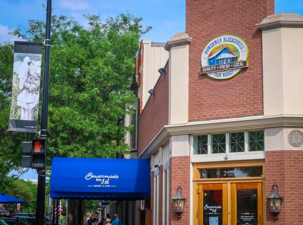 Bowermans on 8th Cafe & Bakery – famous for everything blueberry!Bowerman Blueberry farm is family owned & operated.The blueberry }|farm began in 1954. Blueberry plants covering approximately 23 acres the first year. Since blueberries take 7-10 years to maturity, they also raised corn, and worked in real estate. Eventually, the blueberries began producing sizable quantities of delicious blueberries. Now the farm is over 90 acres and they have this bakery in town and the farm.
