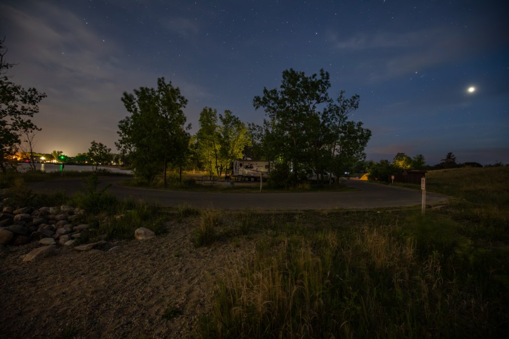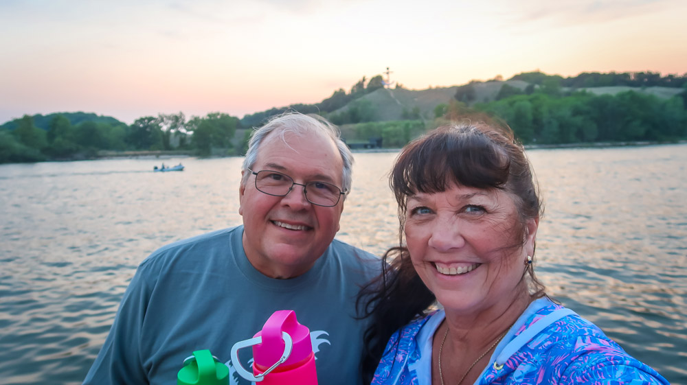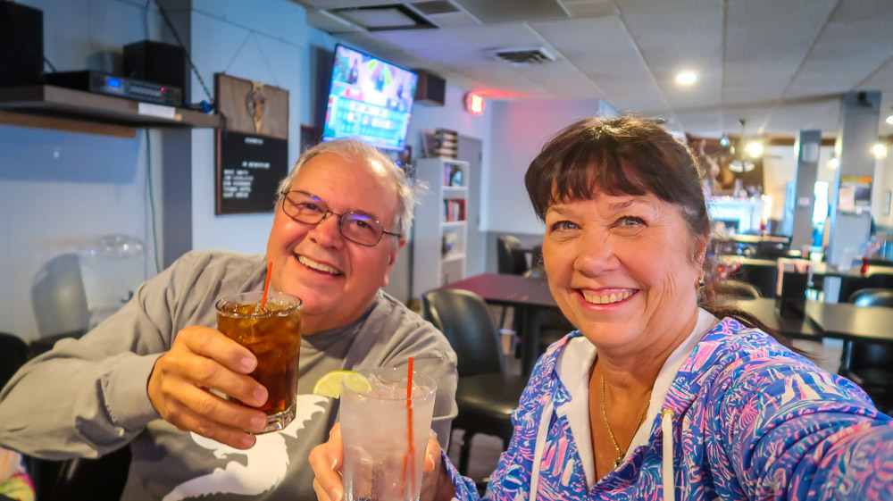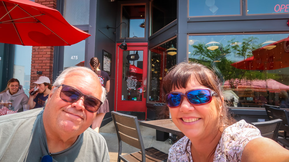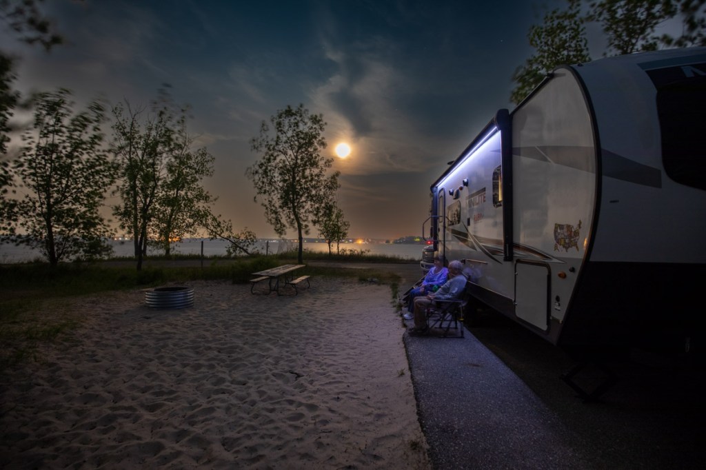 We pulled into Muskegon State Park at 2:48pm 74* Channel Campground, second loop site # 147 Right on the corner of Lake Muskegon in front of us and the channel waterway to Lake Michigan to the right of us! We kept high fiving 🤚each other as we gazed at the water, then our site a few times! Boats were everywhere! Plus our loop only has a total of 5 sites! SCORE!!! 4pm its Happy Hour 🍷 then a quick nap. 6:30pm we left for Grand Haven for an adventure or two! We found the local, free parking area and as we walked out to the sidewalk, I noticed directly across from us an Elks Club. So when in Rome…we went in! I remember fondly, Sunday afternoons and special occasions at the Elks Club in Hackensack with my grandparents. My grandfather was an officer so a few years ago Tim & I became members in honor of him. We sat down at the bar and everyone was so friendly and then started suggesting places for us to visit. We had a drink then said goodbye. 8:15pm walked to Tip-A-Few Tavern that my friend Erika recommended. It’s a local Tavern known for their “Wet Burrito”. Tim tried that and I played it safe with chicken Taco’s. 🌮 We then walked around and stopped at the cute shops and at 9:30 picked up our chairs from the truck and walked down to the amphitheater where we set up by the sea wall. The “Musical Fountain” was recommended and we were told not to miss it! It only runs Friday nights with the regular show, then on Saturdays once a month a themed performance and it just so happens to be today! We enjoyed the different colored lights and fountain show, music 🎶 to “The Greatest Showman”. We made it back to the camper at 11:45pm. We traveled 100 miles today.