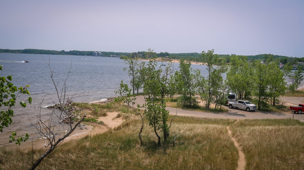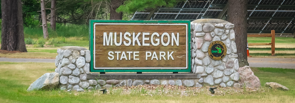 Muskegon State Park – on the shore of Lake Michigan there’s lots of beach shoreline along with forested dunes. Over 12 miles of hiking trails & lots of bike paths. Muskegon State Park was established in 1923. The City of Muskegon gave the Conservation Department (later the Department of Natural Resources) a gift of land to help begin the park. The park has enjoyed much community support over the years and remains an important contributor to local quality of life. Muskegon State Park is home to 3 miles of breathtaking shoreline (2 miles along Lake Michigan and 1 mile on Muskegon Lake), Snug Harbor, forested dunes, two campgrounds, picnic areas, multiple trails and more. One of the park’s popular features is the blockhouse that was originally built by the CCC in the 1930s to provide opportunities for visitors to see in all direction. It sits on the highest point in Muskegon The campground has two loops and is located near the navigation channel walkway . The first loop sites (#1-92) are adjacent to the navigation channel, and the second loop sites (#101-147) are located near the large dune and Muskegon Lake. The second loop features larger sites…only 5 of them!