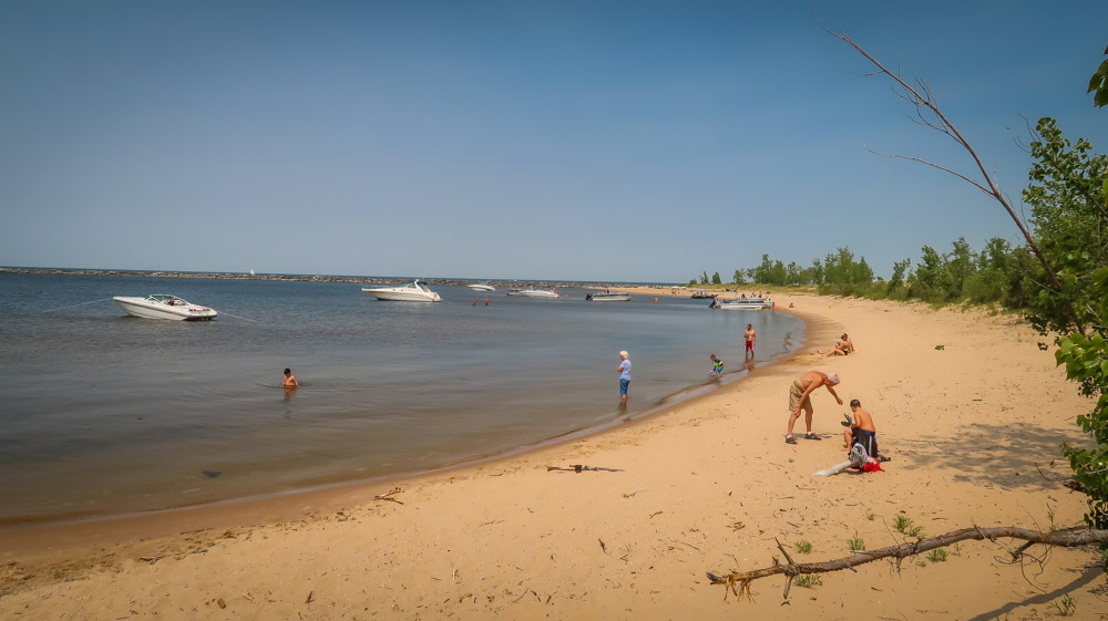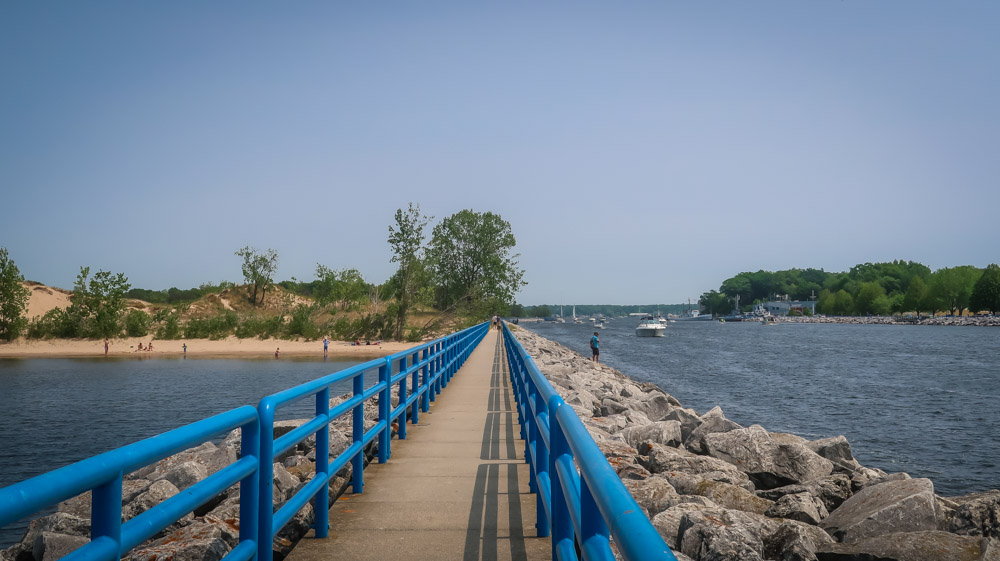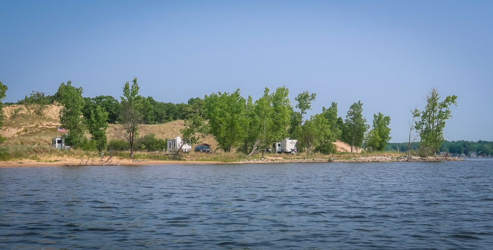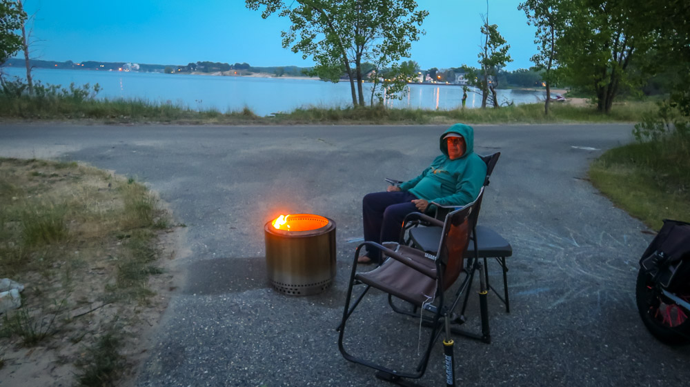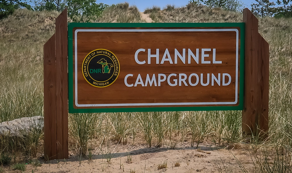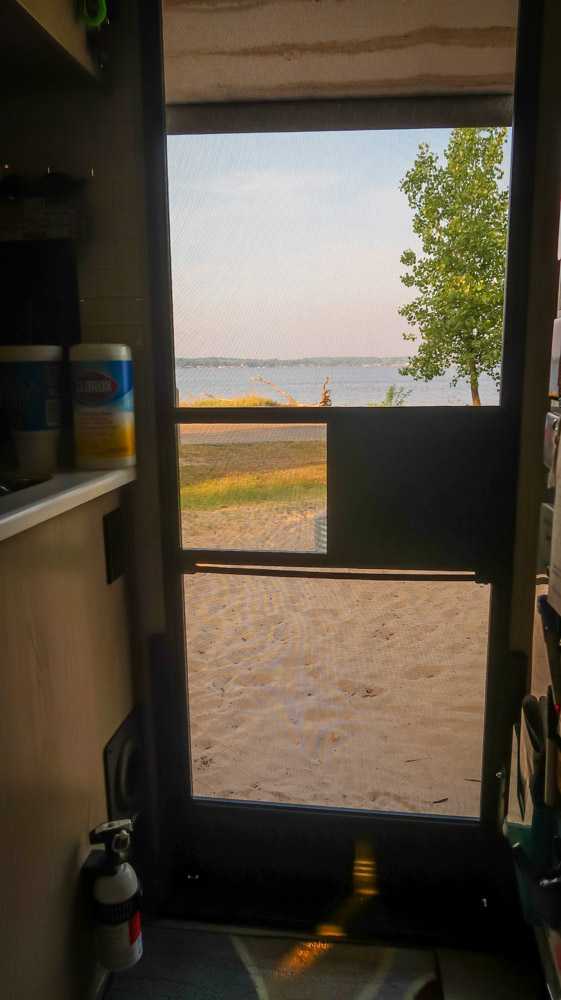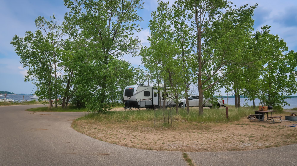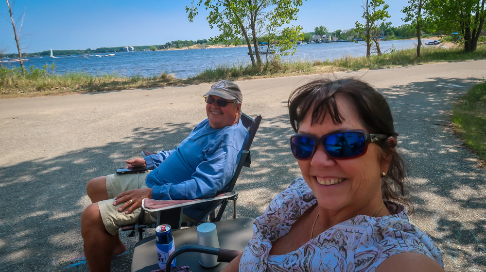 Sunday, Day 35 of our adventure ~ 😱 We placed our Michigan stickers on our US maps today on Ruby! 😂 Beautiful sunny, breezy morning on the water. We enjoyed a leisurely breakfast of eggs, bacon, toast, coffee & tea outside watching the boats, jet skiers, & kayakers. We took a 🚲 bike ride through all the loops at both campgrounds. Enjoyed the beautiful outdoors followed by a walk to the walkway that runs along the channel all the way to the end to Lake Michigan. Still can’t wrap my mind around the fact this is a lake with a sugar sand beach! We came back and had lunch then it was time for me to do the plunge! Yes, i went in Lake Michigan to my neck! It was brrr 🥶 freaking cold but I did it! Hot shower never felt so good! We relaxed outside the rest of the day enjoying talking to other campers walking by reminding us that we have the best site….enjoying the boaters and seeing bright orange oriole’s & kingfishers put on a show for us there at our site. Worked on the blog & pictures and called it a night. We did 0 miles today.