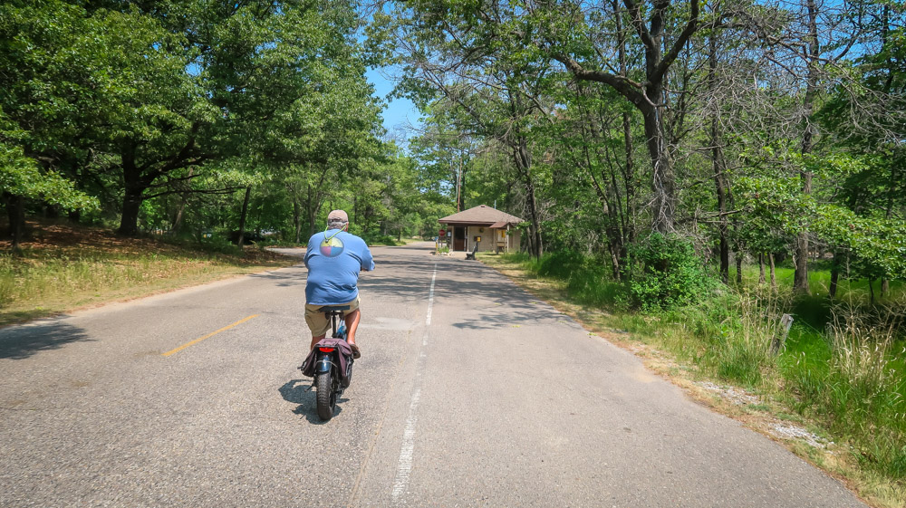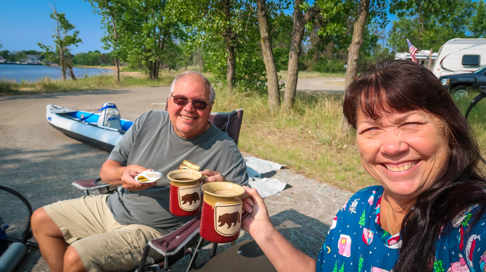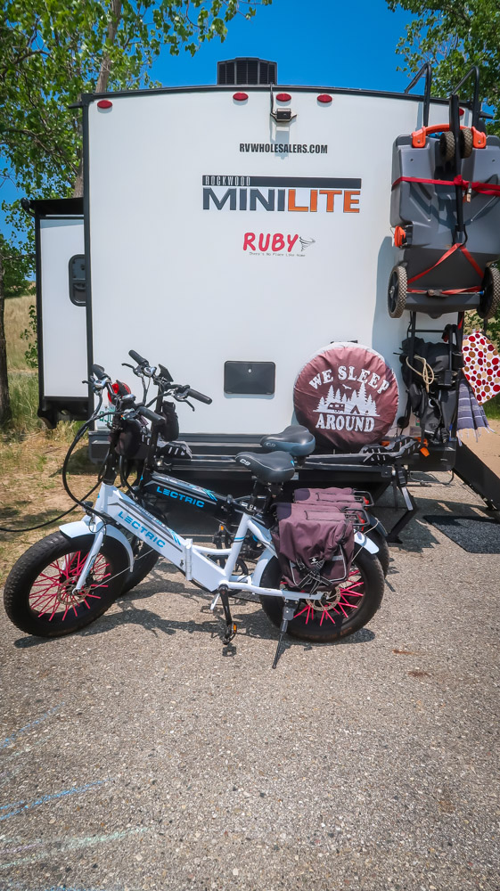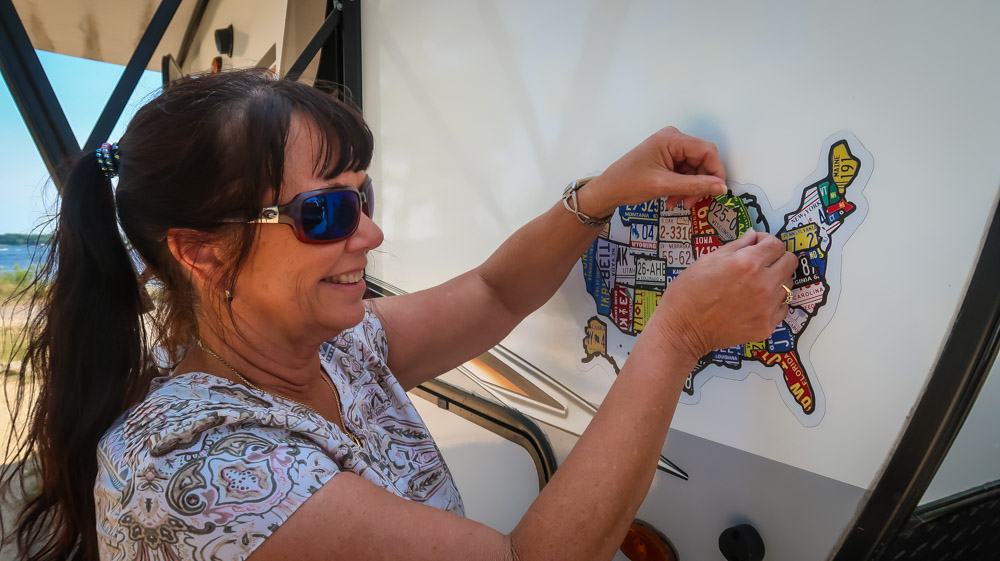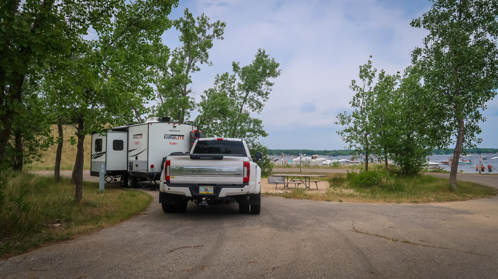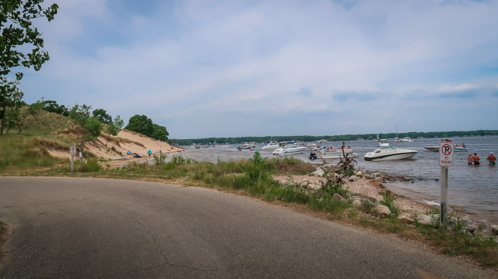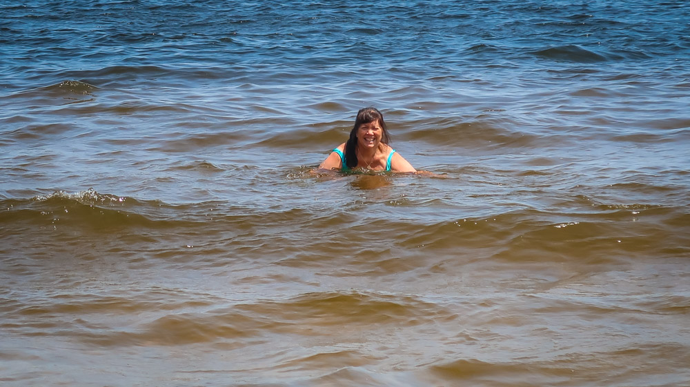 Sunday, Day 35 of our adventure ~ 😱 We placed our Michigan stickers on our US maps today on Ruby! 😂 Beautiful sunny, breezy morning on the water. We enjoyed a leisurely breakfast of eggs, bacon, toast, coffee & tea outside watching the boats, jet skiers, & kayakers. We took a 🚲 bike ride through all the loops at both campgrounds. Enjoyed the beautiful outdoors followed by a walk to the walkway that runs along the channel all the way to the end to Lake Michigan. Still can’t wrap my mind around the fact this is a lake with a sugar sand beach! We came back and had lunch then it was time for me to do the plunge! Yes, i went in Lake Michigan to my neck! It was brrr 🥶 freaking cold but I did it! Hot shower never felt so good! We relaxed outside the rest of the day enjoying talking to other campers walking by reminding us that we have the best site….enjoying the boaters and seeing bright orange oriole’s & kingfishers put on a show for us there at our site. Worked on the blog & pictures and called it a night. We did 0 miles today.