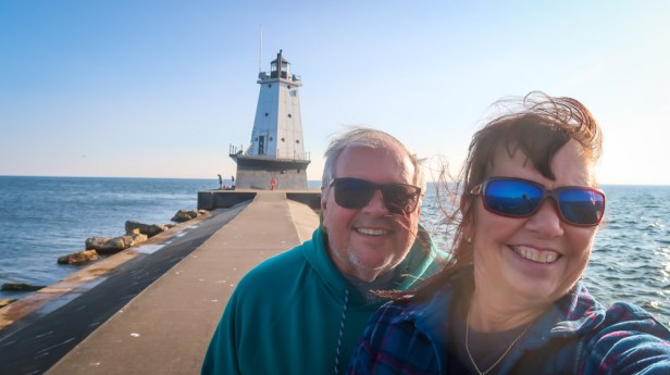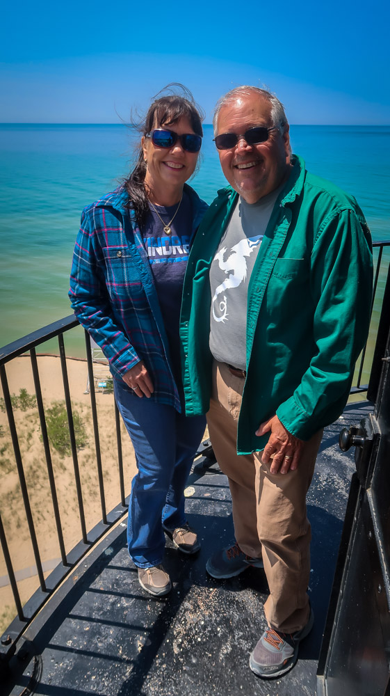 Thursday, June 8th, 2023 10:00am 55* but inside with heater 67*! Spent the morning working on the blog and pictures while Tim did maintenance on the RV. We took our bikes on the 1.5 mile sand trail up to the Big Sable Lighthouse. There we looked through the keepers house, looked at the displays and watched a movie about the lighthouse. We climbed 130 stairs to the top. What a beautiful day and view of the lake and area. Then rode back to RV for a sandwich then back on the bikes over to Hamlin Dam then found a trailhead that went over to an island. We locked up our bikes and away we went. 2.3 mile hike on the Lost Lake Trail over to an island across small boardwalk along the water, up a few stepped wooded areas and back. Dropped the bikes off and we drove into town. First stop was to Meijer for Diesel fuel and firewood.🪵 48.760 gallons @ $3.589/gallon = $175.00 Then our 2 daily Diet Coke’s 🥤 & some firewood. We’re all set now for some ice cream 🍨 at The House of Flavors! OMG were we blown away when we walked in, expecting just an ice cream shop but no, a diner with an ice cream parlor. It’s also been there for 75 years and it’s also the ice cream factory. We didn’t notice the big tanks until we were leaving in the back! We were overwhelmed with the menu and the waitress explained they are known for their turkey dishes. Well it’s 4pm so we decided to get dinner there. I got the traditional turkey dinner with all the fixings and it was very good and Tim got the turkey reuben which was amazing. So ….we got 2 pints of ice cream to go! On our way back the lake was calm so we decided to give the Ludington North Breakwater Lighthouse another try. About a 1/4 mile out on the concrete jetty we came upon the lighthouse whose base is in the shape of a ship. Really cool! Came back to the RV where we had a really nice campfire and our neighbors joined us till it got to cold out (10:30ish). Time for bed! We traveled 11 miles today.