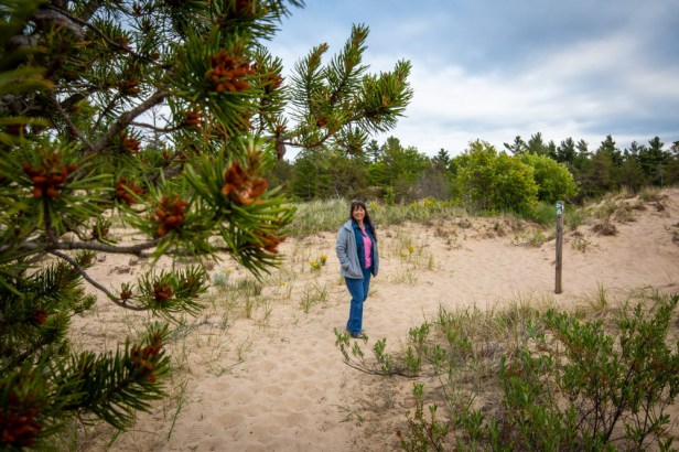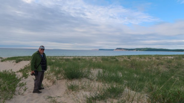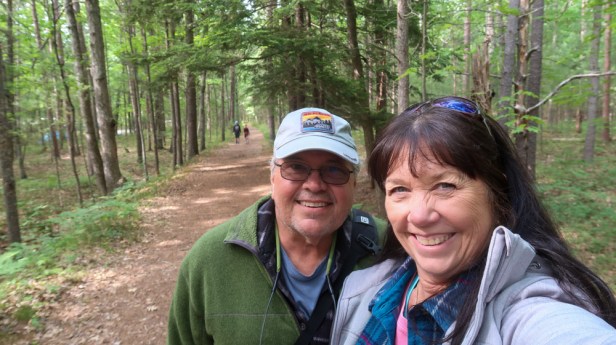We took the 3 mile Dunes Trail at the end of the campground, over Alligator Hill dunes out to Lake Michigan. It was a heavily wooded trail in the beginning , then turned into a step sandy trail. When we got to Lake Michigan, it was overcast, cool & windy. The Lakeshore was rocky. There we saw Piping Plovers nesting. One actually ran in front of me on the beach and at first I thought it was sand piper bird! We found some really cool rocks along the water. Brrr cold water! 🥶 We got back to the RV around 8pm and grilled Cherry sausages and soup for dinner. It was 62* inside the RV….time for heater to go on. We then read the brochures and made a plan of drives, hikes and things to explore for the next few days. We traveled 113 miles today. Good night all! 🛌 😴 💤