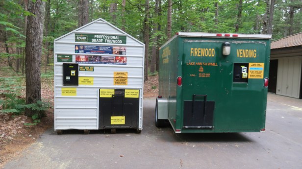 🎶 On the road again 🎶 , lots of deer 🦌 running through the forest, and now seeing a lot of snowmobiling signs, & trees 🌲 Christmas tree farms as we go through these cute little towns. Saw the Houghton River, Lake City & we stopped in Cadillac at a Meijer for diesel to top off the back tank.31.075 gallons @ $3.519/gal = $109.36. Then we went inside to stock up and 2 Diet Coke’s + groceries = $87.38 (water, lunch, cards, etc). We’re ready for more adventures. Driving through the town of Beulah, saw a sign that read “Cherry Hut” and it looked really cute and next door was a cute store with flowers so …..Tim turned around! When we walked in it was like stepping back in time. All the servers were in red & white striped dresses and pants, clean white shoes, cherry valances on the windows, and antiques all around. We each had a slice of cherry pie ….which was so warm and delicious that we bought a whole pie to take with us! 🍒🍒🍒 Then visited the shop next door…Market Basket which had beautiful flowers, plants and fresh fruits & vegetables. 3:10pm we arrived at Platte River Campground at Sleeping Bear Dunes National Lakeshore. The ranger checked us in and suggested trails etc for us to explore. On our way to loop 2, site 210! Beautiful, big, level, wooded site with electric. 5:00pm it’s now 58* Decided to take a walk around loop first. 🤷🏼♂️🤷🏻♀️Our first time ever seeing a firewood bundle dispenser at a campground. These 2 big, metal boxes had a slot to insert money or credit cards and then doors to dispense your firewood! 🤦🏻♀️ One was processed fire log and the other machine was for bundled firewood. $7.00 each.