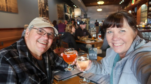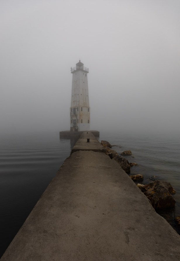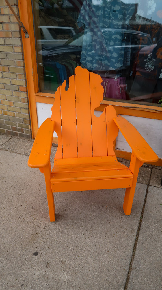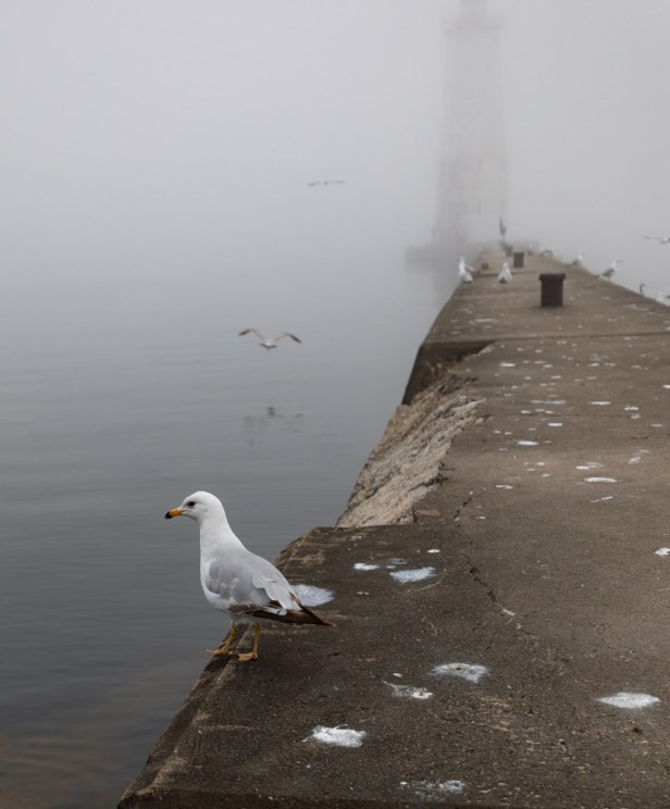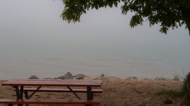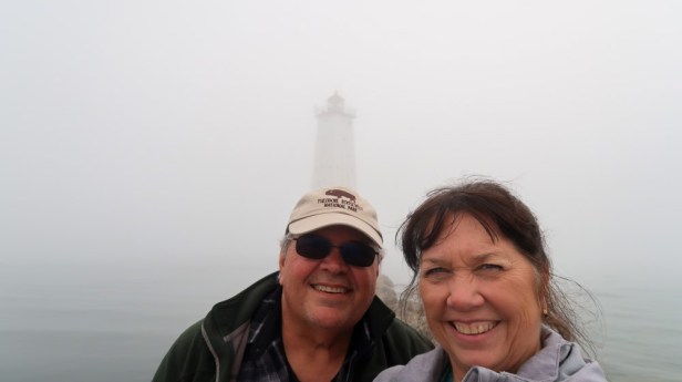 The 📱 phone rang and unfortunately it was regarding a water leak outside, back at our house in Florida. With a few phone calls and very helpful neighbors, they were able to turn off the water to the softener and bypassed it so the house would still have water! 💦 Tim then ordered the head section to the water softener unit and he’ll fix that the day we get home! That calls for a strong, very carbonated Diet Coke so off to the local EZ Mart. 🥤There the cashier, who was born & raised in the area, suggested we check out the town of Frankfort. Only 8 miles away for our next adventure. We drove around this cute little town but as we approached Lake Michigan is was so foggy we couldn’t see the shoreline or the water. Tim parked in the center of town and we decided to explore it. We were on the hunt for a long sleeve shirt for Tim, postcards, shaving cream and a rock scooper! Wow… bought postcards @ $0.35 each (10) & shaving cream for $8.00! 😲 No luck in any of the cute stores for a long sleeve shirt but we did come across Storm Cloud Brewing Company! Tim enjoyed their 31 Planes IPA so much he bought a long sleeve shirt! Score! Checked out the rest of the stores and town to find our selves now at the lakeshore. We walked out to the Frankfort Breakwater Lighthouse and the fog was so thick that visibility was roughly 150 ft! So very cool. 🌫️ Headed back to campground. It’s only 54* out! 🥶 😢 Traveled 52 miles today.