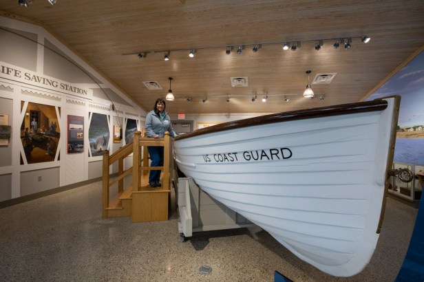 Two basic designs were used for the rescue boats. One was a relatively light (1000 pounds) 23 foot monomoy boat that could be launched from the boathouse by rail or hauled on horsedrawn cart down the beach if a wreck were a long way from the station. It had a shallow draft, centerboard, and sail. The other design was a 26 foot Beebe-McLellan surfboat launched from the rails that extend from the boathouse to the water. Air tanks under the deck, in the bow, and along the sides made it buoyant. It also had a centerboard and mast, and was self-bailing.
