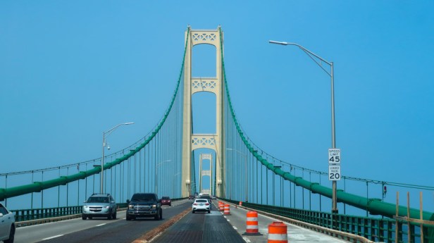 The Mackinac Bridge ~ also referred to as the Mighty Mac or Big Mac) is a suspension bridge that connects the Upper & Lower peninsulas of Michigan. It spans the Straits of Mackinac, a body of water connecting Lake Michigan & Lake Huron, 2 of the Great Lakes. Opened in 1957, the 26,372-foot-long bridge is the world’s 27th longest main span and is the longest suspension bridge between anchorages in the Western Hemisphere. The Mackinac Bridge is part of (I-75) and the Lake Michigan and Huron components of the Great Lakes Circle tour across the straits; it is also a segment of the U.S. North Country National Scenic Trail. The bridge connects the city of St. Ignace to the north with the village of Mackinaw City to the south. Envisioned since the 1880s, the bridge was designed by the engineer David B Steinman and completed and opened on November 1, 1957 only after many decades of struggles to begin construction.The bridge has since become an iconic symbol of the state of Michigan. It remains the longest suspension bridge with two towers between anchorages in the Western Hemisphere. The length of the bridge’s main span is 3,800 feet which makes it the third-longest suspension span in the US. The structure took 48 months to complete with over 3, 500 workers and $99,800,000 dollars. Its total length is 5 miles, or 26,372 feet. The main towers are 552 feet above water.