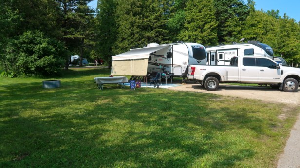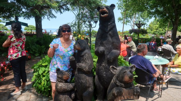 🌞Sunny beautiful day to celebrate Tim! I made us ham & cheese omelets which we enjoyed outside with our coffee & tea. Gave Ruby a good cleaning, flushing & packed her up for today’s a travel day. Before leaving I cut a variety of colors of lilacs and wildflowers to put in a vase. We pulled out at 11am & it was 82* already! 11:20 at Blarney’s EZ Mart for our Diet Coke’s!🥤The drive out of town was beautiful. 🏡 Homes were beautiful with lots of flowers and decorated very nicely. We decided to take the back country roads and with doing so took this narrow road along Lake Michigan and through the Tunnel of Trees 🌳 up to Cross Village. 12:31pm we arrived at Legs Inn Polish Restaurant for lunch. High five ✋ again for as we got up to the hostess we got the last table and the couple behind us were told it would be a 45 minute wait. This place is indescribable! Starting with the gnarly door with an antler rack as a door handle, the stove legs that trim the roofline, timbers and stones then as you walk inside….well there’s timbers, limbs & driftwood carved into creatures and furniture throughout every room! We enjoyed a drink then I had a delicious Pierogi dish and Tim had the “Old World Sampler”, consisted of Polish Hunter Sausage, homemade Bigos and Pierogi’s. The waitress then talked us into sharing the Polish Berry Szarlotka which was amazing. Then we took a walk through the restaurant leading us outside to the big garden area and benches over looking Lake Michigan. What an amazing view! Then we strolled across the street to the Peninsula’s Gift Shop then over to the newly opened Petoskey Brewery where we in enjoyed a 🍺 Cranium Crush (Raspberry Waffle Cone Cream Ale) & a Michigan Cherry Craft Hard Seltzer 🍒 outside on the patio area. Time to get back on the road again! What a sight to see… as we crossed this huge suspension bridge! $8.00 to cross over to the Upper Peninsula on the Mackinaw Bridge…”The Mighty Mac”! 🌉 We are now in the Upper Peninsula! 3:10 we stopped at the visitor center and the 2 gentleman working there were so helpful! They both kept giving us maps, brochures of things to see and showed us pictures on their phones and so much more! What a great experience from Yuppers who love the area. 3;30pm arrived at Straits State Park. Site #79 right across from Lake Huron. Big level site! Electric only site. Got all set up then took a walk to the waters edge, gazed at the bridge, tried the water and yup brr cold. We walked around both camp loops and met a couple with an Airstream who Tim had to stop and talk to them about it. They were gracious enough to show us the inside. We enjoyed happy hour with them after learning they were all nurses who used to work at Palm’s West Hospital and lived in Loxahatchee for years (right where we live). We knew some of the same group of nurse’s and doctors! Talk about a small world. We came back to the RV and finished a post for the blog then grilled hamburgers along with green beans and carrots. We sat outside till dark …which is like 10pm. Across the water on the other side of the bridge, where the Trolls are we watched the Sunday evening Fireworks. Chilly night! Traveled only 67 miles today.