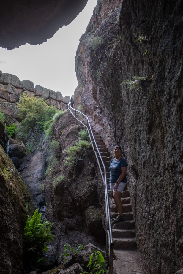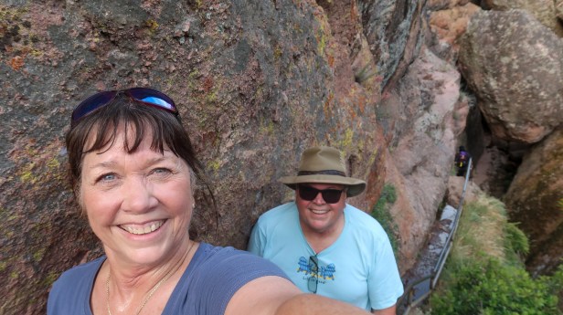 4:10pm We arrived at Pinnacles National Park and as we drove in, Tim stopped and we both looked at each other like….WTH…It has a pool and it’s packed!!! First stop was the dump station and filled up with fresh water! We arrived at site 111D, needed 3” lift on right side. This is an electric site! After setting up we took a walk around 1/2 of the park. This park has the largest concentration of condor birds that nests here. The high peaks are rhyolite breccia angular fragments that were ejected from volcanoes and cemented by ash and mud! Tonight was Taco’s for dinner then we relaxed and watched the end of the Voice. Bedtime! We traveled 173 miles today.