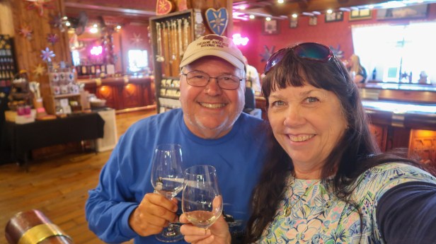🙋🏻♀️💐Hello June….Saturday, it’s 52° outside this morning and 60.8° inside! 🥶 Brrrr!!! 8:30am and its oatmeal, blueberries and coffee & teatime. 9am its 55°. Dressed and packed and at 11am headed down the winding, narrow Ca 1 HWY! No guard rails!! 🤦🏻♂️ We stopped about 11:30 for there was a roadside stand selling California Cherries 🍒 so had to buy a big bag! As we traveled, the road was still in the clouds, which made it hard to see the front of the truck. Came upon Old Creek Road and it had a sign saying… RV Trailers NOT ADVISED! HMMMM. Fields & Fields, all the way the mountains were covered in vineyards. 12:15 took the exit to Bakersfield to go to our friends Jim & Kelly’s favorite winery. 12:30 we arrived at Tobin James Cellars and did the wine tasting there and called our friends. 3:10pm stopped for diesel in King City, Ca…. $4.95/gal ~ 33.9 gallons = $168.54